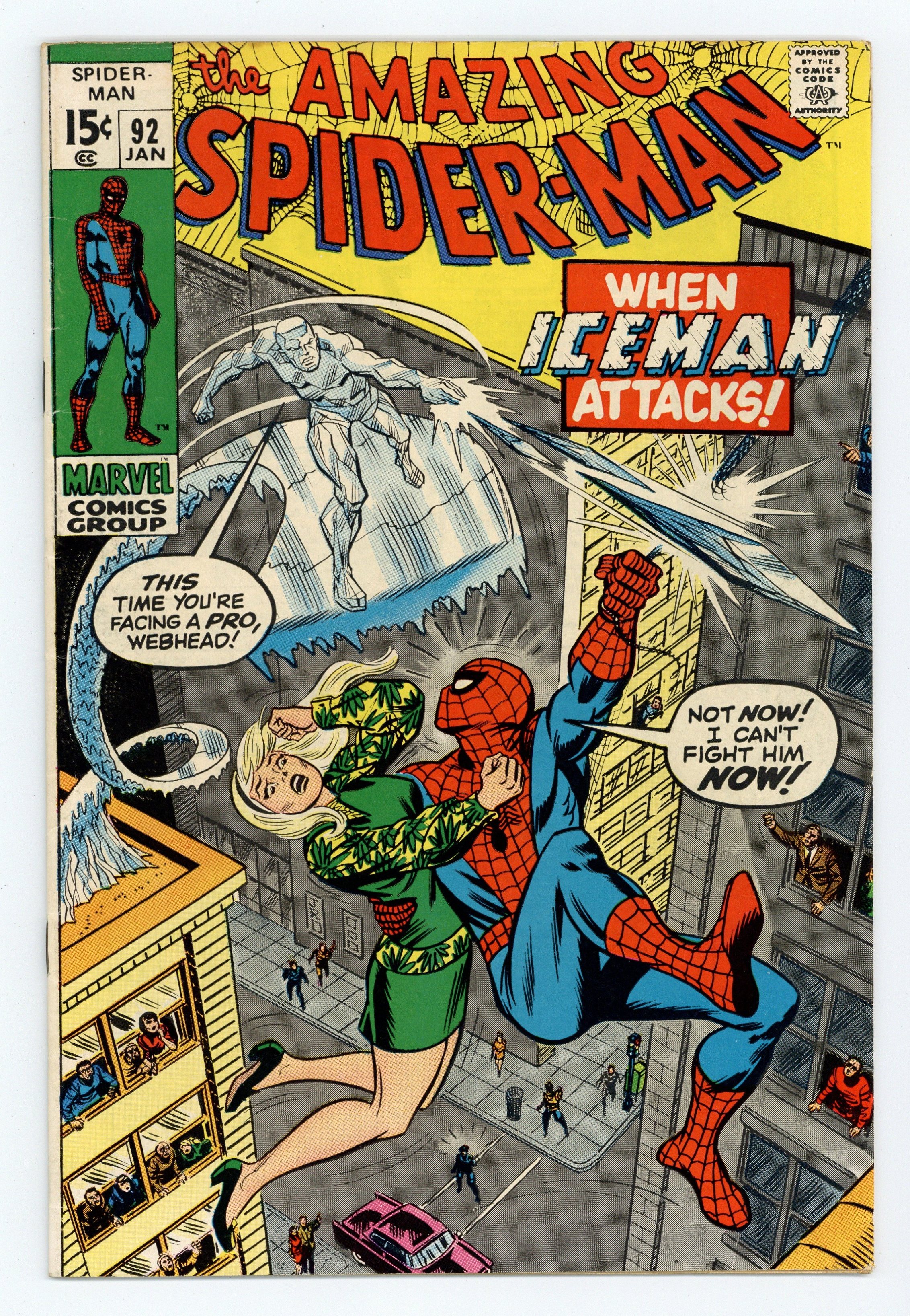 Tags: Marvel Legacy Numbering: Amazing Spider-Man (part 92), Spider-Man$47.00"When Iceman Attacks" Part 2 of 2. Guest-starring Iceman. Script by Stan Lee. Pencils by Gil Kane. Inks by John Romita and Tony Mortellaro (backgrounds). Cover by John Romita. In a surprising move, Spider-Man absconds with Gwen Stacy to keep her away from the deceitful Sam Bullit. The web-slinger would never harm his dear girlfriend, but a young man standing on the sidewalk named Bobby Drake doesn't know that. So when Iceman (of the original X-Men) sees Gwen in apparent distress, he zooms to the rescue! However the wall-crawler doesn't have time to fight Iceman, because he's just watched Sam Bullit's goons abduct Joe Robertson! Can the web-slinger convince Iceman to fight with him instead of against him? Robbie's life depends on it! Cameo appearance by J. Jonah Jameson. (Notes: Marie Severin designed the preliminary cover. This story was reprinted in Marvel Tales #73.) 36 pages. Cover price $0.15.
