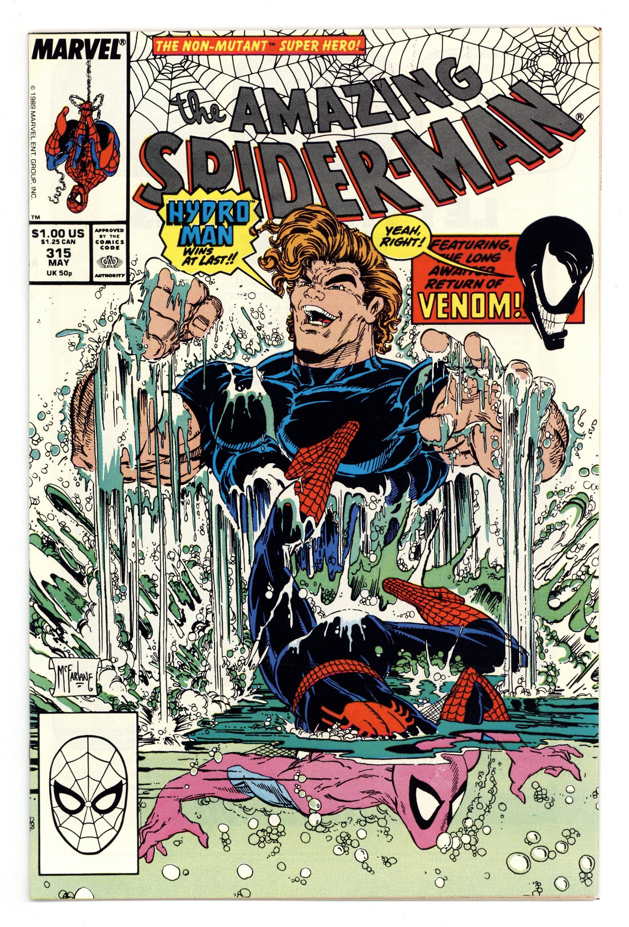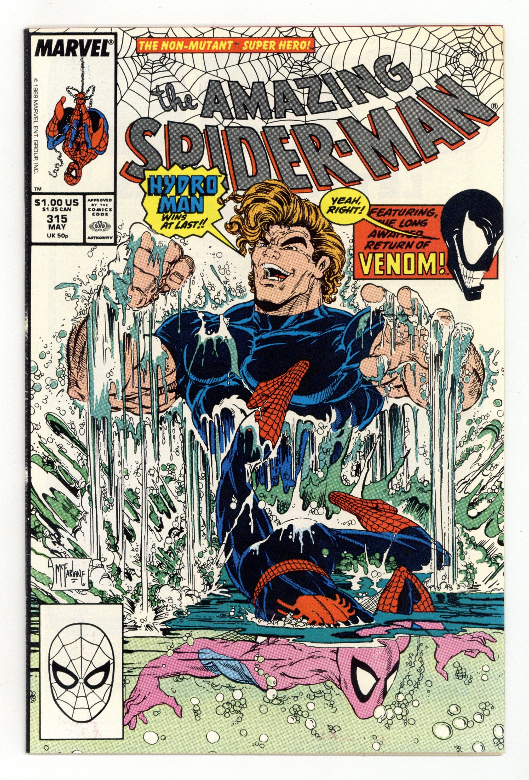 Tags: Marvel Legacy Numbering: Amazing Spider-Man (part 315), Print Run Statistics$46.50Direct Edition. "A Matter of Life and Debt!" Script by David Michelinie. Art by Todd McFarlane. Cover by Todd McFarlane. Life is full of challenges and on this day Peter Parker and his web-spinning alter-ego face three! The first, Hydro-Man attempts a payday robbery! But the Spectacular Spider-Man stops the heist! The second, Nathan Lubensky steals money from Aunt May to pay his gambling debts! However, Peter quickly shuts down his operation! And the fateful third...Venom escapes from the Vault! Wow, this challenge will be more difficult and more deadly starting next issue! Cameo appearances by Mary Jane Watson and Kristy Watson. (Notes: Venom previously appeared in Amazing Spider-Man 300.) The letters page contains a statement of ownership: average print run 451,930; average paid circulation 271,100. 36 pgs. Cover price $1.00.