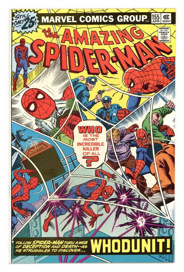 Tags: Marvel Legacy Numbering: Amazing Spider-Man (part 155), Spider-Man$22.50"Whodunit!" Script by Len Wein. Art by Sal Buscema (layouts) and Mike Esposito (finishes). Cover by John Romita. In shocking fashion the co-developer of the Worldwide Habitual Offender database is found murdered in his research lab! And the task of finding the killer falls to none other than your friendly neighborhood Spider-Man! The web-slinger scours the city searching for suspects! But the trail of clues leads back to the lab! Who is the killer? Who indeed! Cameo appearances by Joe Robertson and J. Jonah Jameson. (Notes: The letters page includes a statement of ownership: average print run 530,714; average paid circulation 273,773. This story was reprinted in Marvel Tales 132. A 30-cent cover price variant exists for this issue.) 36 pages. Cover price $0.25.