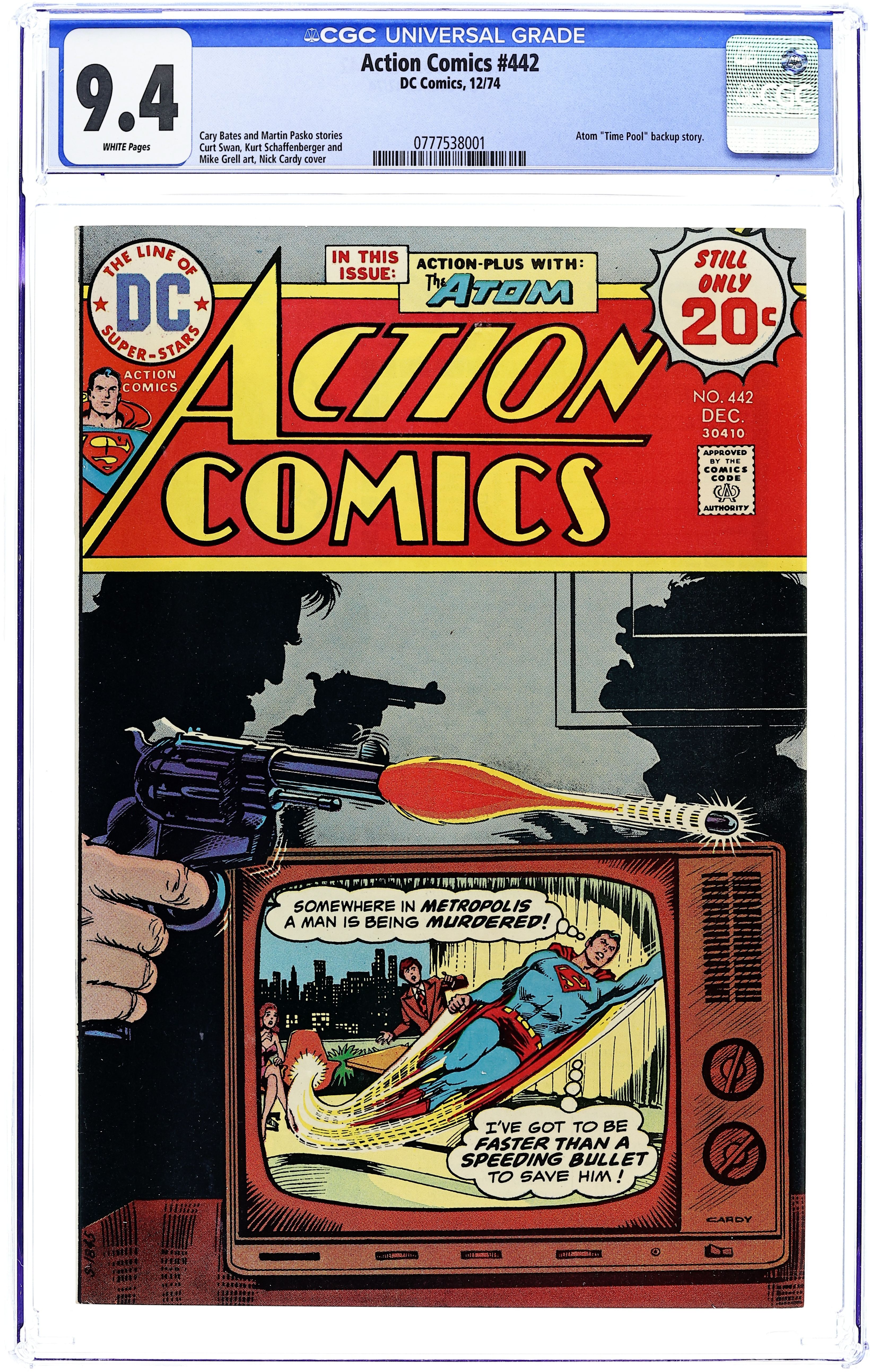 Last 20-cent cover price. Cover by Nick Cardy. "The Midnight Murder Show!", script by Cary Bates, pencils by Curt Swan, inks by Kurt Schaffenberger; Superman enacts a desperate plan to save the life of kidnapped TV host Johnny Nevada. "The Little Man from Mars!", script by Martin Pasko, art by Mike Grell; To find the missing page to an important diary, the Atom goes back in time to Grovers Mill, New Jersey on October 30, 1938, the date of the "War of the Worlds" broadcast by Orson Welles. 36 Pages, Full Color. Cover price $0.20.