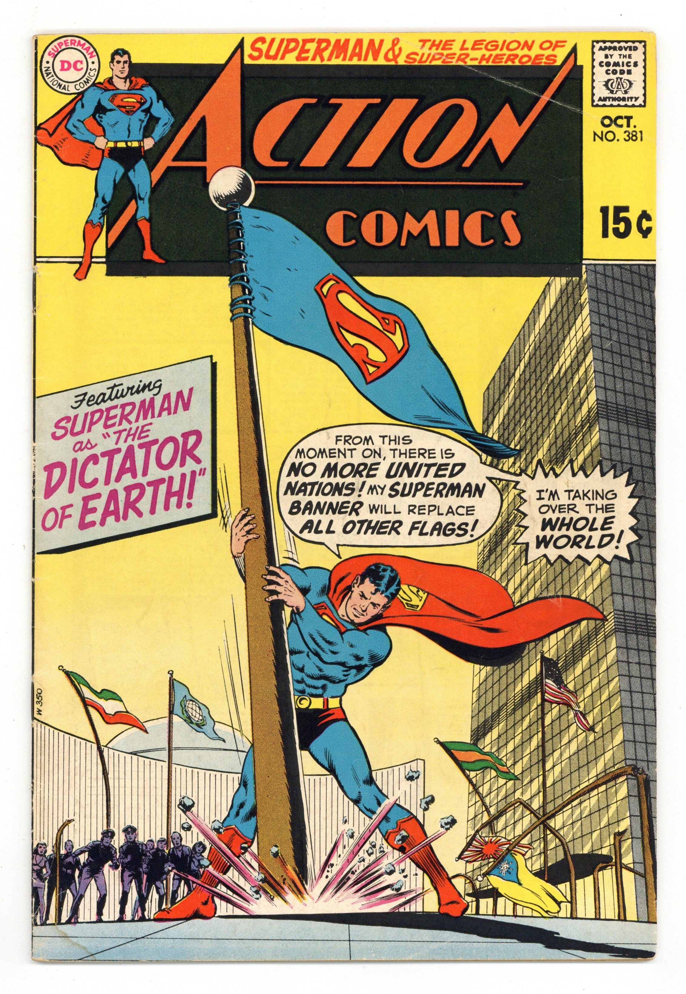 Cover pencils by Curt Swan, inks by Murphy Anderson. "The Dictator of Earth!", script by Leo Dorfman, pencils by Curt Swan, inks by George Roussos; Superman decides not to expose himself to Gold Kryptonite and instead agrees to stand trial at the United Nations for his apparent misdeeds. Tales of the Legion of Super-Heroes backup, "The Hapless Hero!", script by Jim Shooter, pencils by Win Mortimer, inks by Jack Abel; While other Legionnaires spend time with their families, Matter-Eater Lad has an argument with his father; He ends up back at Legion headquarters where Shrinking Violet complains about her boyfriend troubles; Appearances by Matter-Eater Lad, Shrinking Violet, Duplicate Boy, Braniac 5, Chemical King, Saturn Girl, Ultra Boy, Phantom Girl, and Projectra. Half-page Super-Turtle gag by Henry Boltinoff. Batman ad. 36 Pages, Full Color. $0.15 Cover price $0.15.