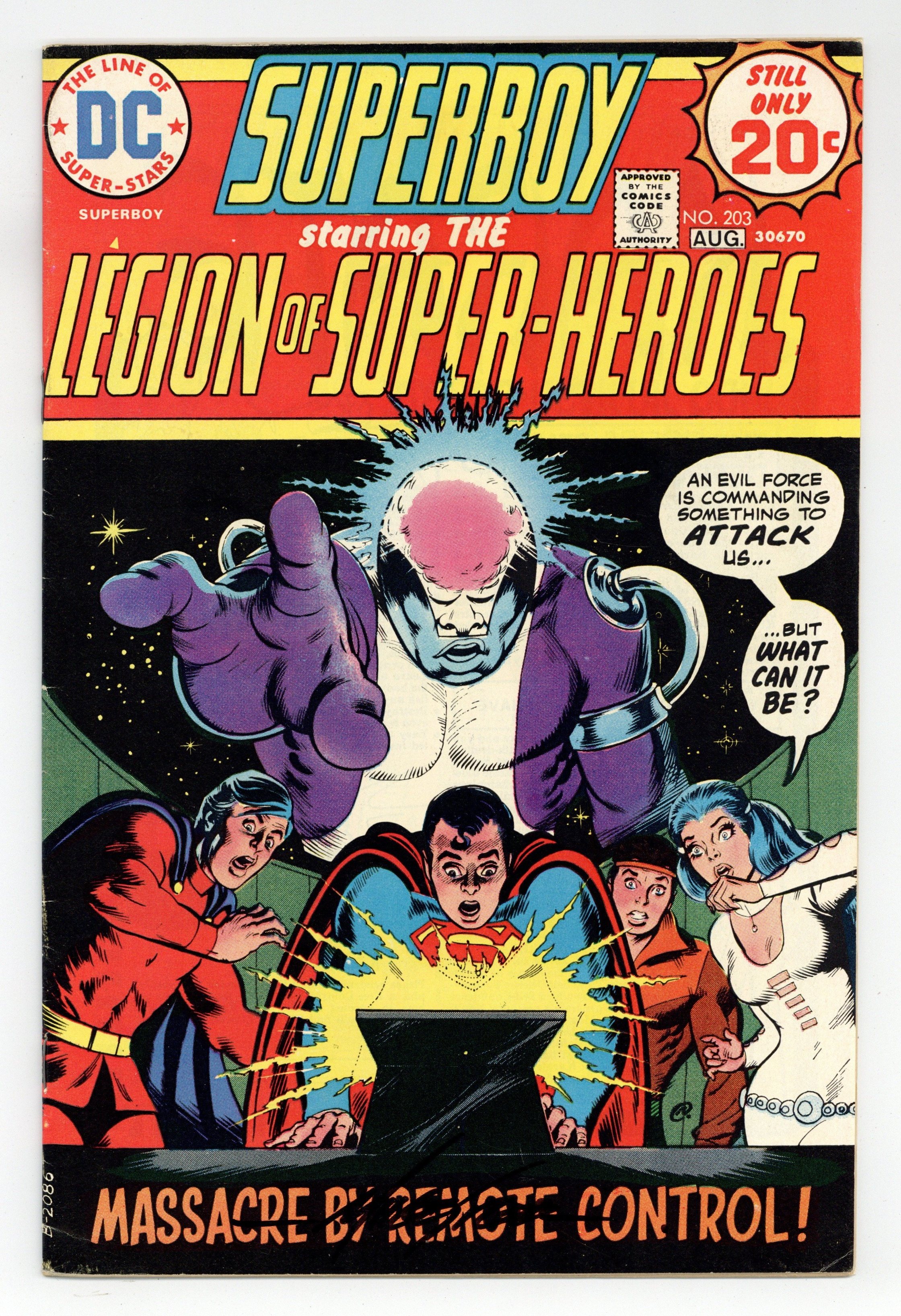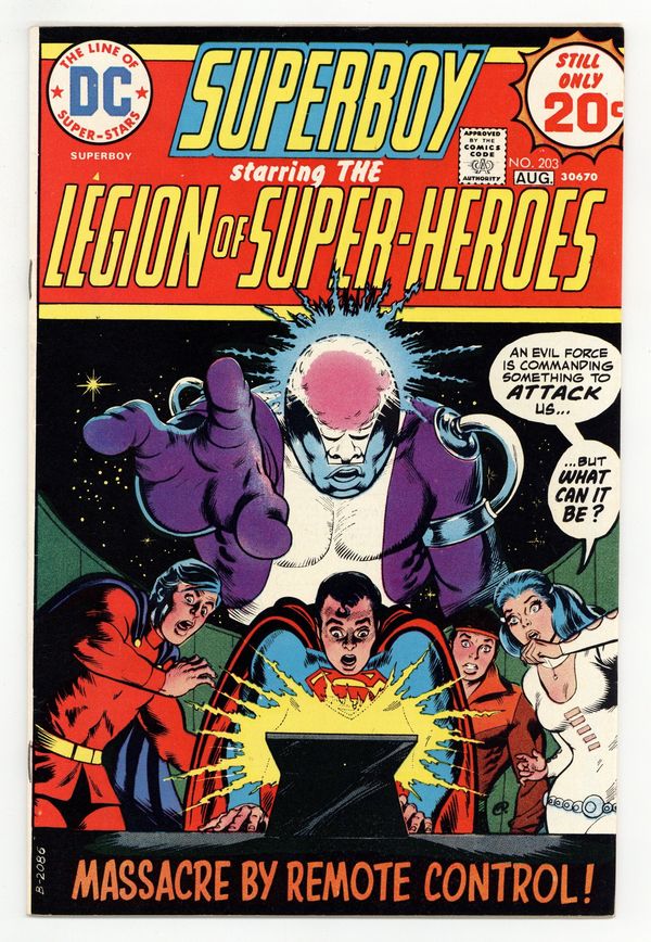 Tags: Legion of Superheroes, Superman$17.00Cover art by Nick Cardy. Massacre by Remote Control, script by Cary Bates, art by Mike Grell; After the Legionnaires run a practice drill on protecting their headquarters, Invisible Kid collapses; He reveals that when he turns invisible he can see an invisible world and one of its inhabitants, Myla; Later, Dream Girl dreams that Validus is coming to attack the Legion; Saturn Girl confirms that the components of Tharok's brain being held by the Legion are summoning Validus; Validus attacks Legion headquarters and kills Invisible Kid just as he destroys the components of Tharok's brain controlling Validus. 36 Pages, Full Color. Cover price $0.20.