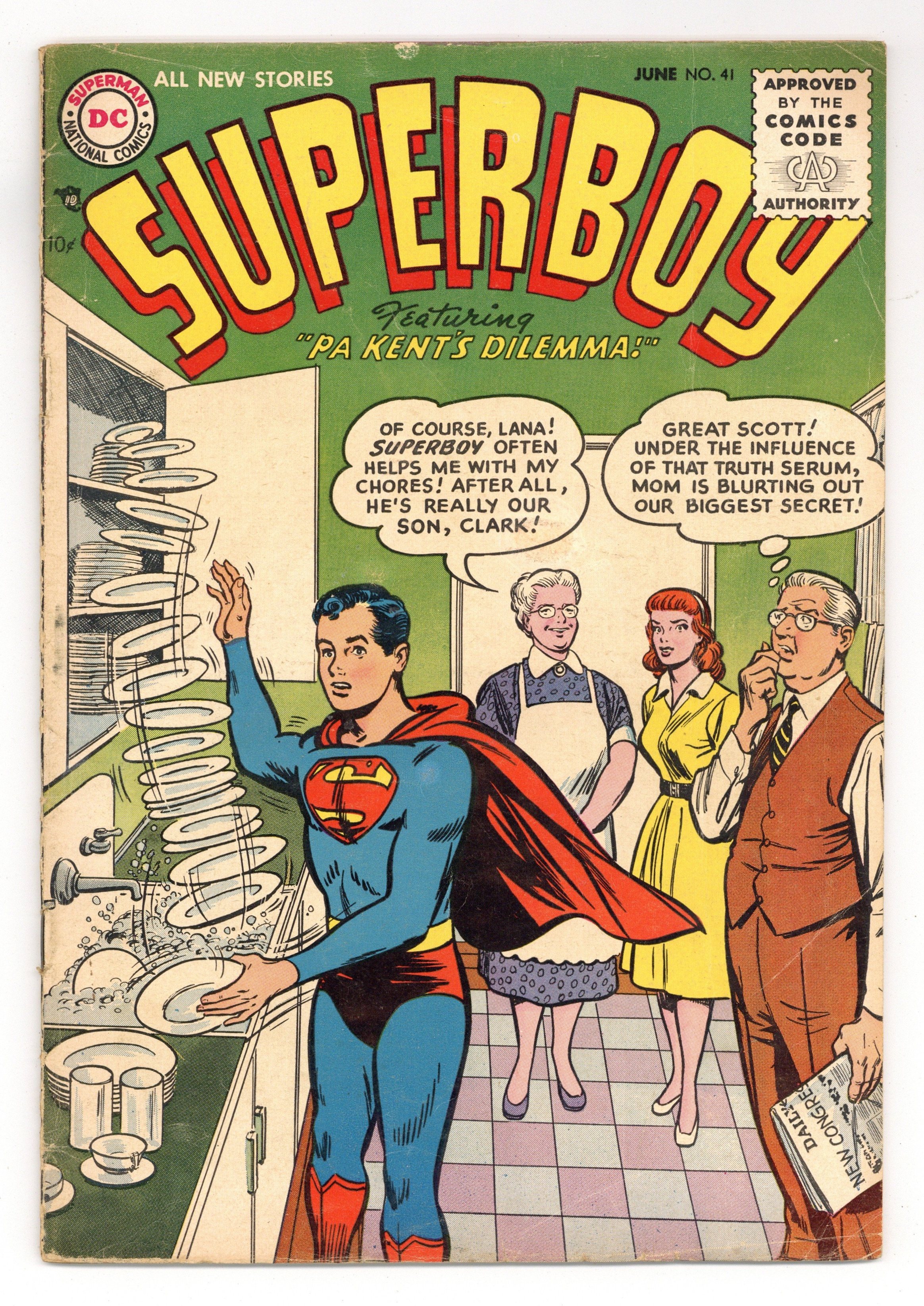 Cover art by Win Mortimer. Superboy Meets Super-Brave!, pencils by Curt Swan; Superboy mysteriously loses his strength when he meets an Indian boy who has magical powers. The Junior Sleuths of Smallville!, art by John Sikela. Self-Propelled Tractor--Superboy's Workshop. Crossed Off text story by Jack Miller. Pa Kent's Dilemma!, art by John Sikela; Ma accidentally drinks a truth serum that causes her to continually blurt out Clark's secret. Peg humor page by Henry Boltinoff. There May Be a Career in Health for You! public service announcement starring Buzzy, script by Jack Schiff, art by Win Mortimer. 36 Pages, Full Color. Cover price $0.10.
