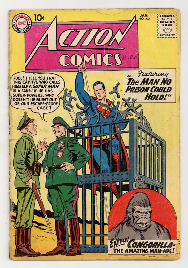 Origin and first appearance of Congorilla. Cover pencils by Curt Swan, inks by Stan Kaye. "The Man No Prison Could Hold!", script by Bill Finger, pencils by Wayne Boring, inks by Stan Kaye; Superman becomes a prisoner of an island work camp in order to discover what weapon a Nazi scientist is creating. One-page Tricksy, World's Greatest Stunt Man story by Henry Boltinoff. Congo Bill series becomes Congorilla with "The Amazing Congorilla!", script by Robert Bernstein, art by Howard Sherman; Congo Bill saves the life of tribal Chief Kawolo, who gives him a magic ring that can cause his mind to be exchanged with that of a golden gorilla; Later, a movie crew tries to capture the now-intelligent Congorilla. Supermen of America ad. "The Graveyard of Space" starring Tommy Tomorrow, script by Otto Binder, art by Jim Mooney. 36 Pages, Full Color. $.10 Cover price $0.10.