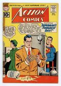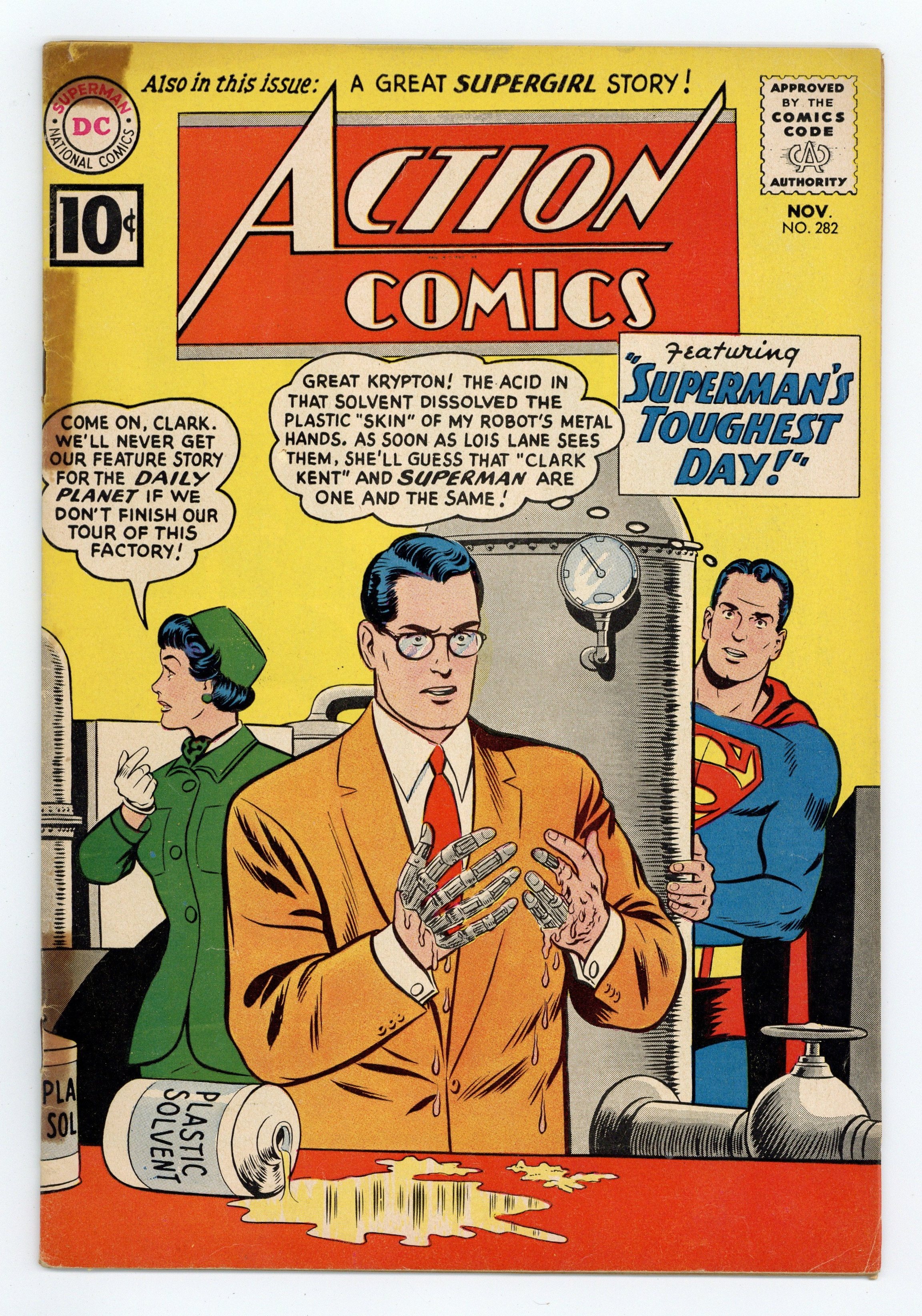 $47.50Last 10-cent cover price. Cover pencils by Curt Swan, inks by Stan Kaye. "Superman's Toughest Day!", script by Bill Finger, art by Al Plastino; A day in Superman's life. His Clark Kent robot has to avoid showing the damage to his hands while on a date with Lois. One-page Shorty story by Henry Boltinoff. One-page Sagebrush Sam story by Henry Boltinoff. "The Supergirl of Tomorrow!", script by Jerry Siegel, art by Jim Mooney; Using a time machine, a powerless Supergirl travels to the future, where her powers return and she frees humanity from the tyrannical reign of the Clan of Censors. One-page Little Pete story by Henry Boltinoff. 36 Pages, Full Color. $.10 Cover price $0.10.