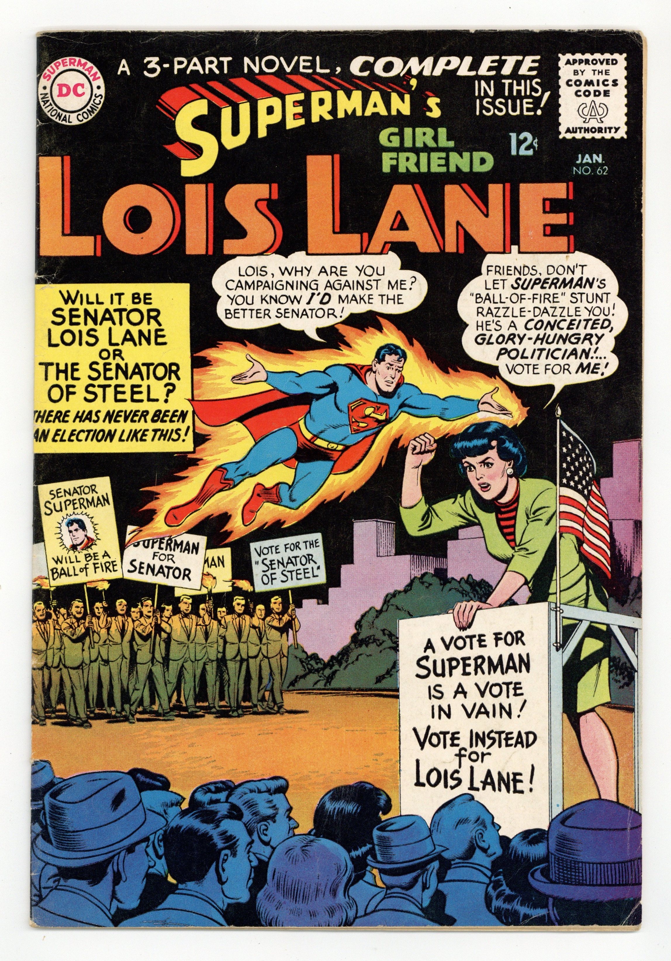 Cover art by Kurt Schaffenberger. The Magic Card! public service announcement about libraries, script by Jack Schiff, art by Bernard Baily. Lois Lane's Anti-Superman Campaign! Part I, script by Leo Dorfman, art by Kurt Schaffenberger; Lois gets angry when Superman runs for the U.S. Senate and acts like a typical politician, so she has the president of her fan club nominate her as a competing candidate. House ad for Superman #183. Mr. Mxyzptlk's Election Magic! [Lois Lane's Anti-Superman Campaign! Part II]; Superman leads Lois in the polls until Mr. Mxyzptlk helps her campaign with his magic. The Super-Election! [Lois Lane's Anti-Superman Campaign! Part III]; Superman reveals that his candidacy was a ruse to distract Mxyzptlk. Rocky and Bullwinkle star in a one-page Cheerios ad. 36 Pages, Full Color. Cover price $0.12.