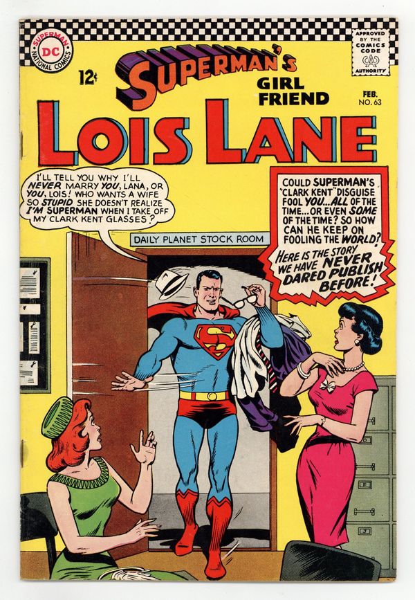 Cover art by Wayne Boring and Kurt Schaffenberger (Lois and Lana). The Satanic Schemes of S.K.U.L!, script by Leo Dorfman, art by Kurt Schaffenberger; Lois discovers that the replacement for Perry White, Van Benson, is a member of S.K.U.L. House ad for Our Army at War #164. House ad for Wonder Woman #160. Lois Teams Up with Lana Part 2 [The Satanic Schemes of S.K.U.L.!]; The mystery of the Superman Killers' Underground League deepens. House ad for The Brave and the Bold #64, art by Gil Kane. Meet TV's Lois Lane article about Noel Neill. 36 Pages, Full Color. Cover price $0.12.