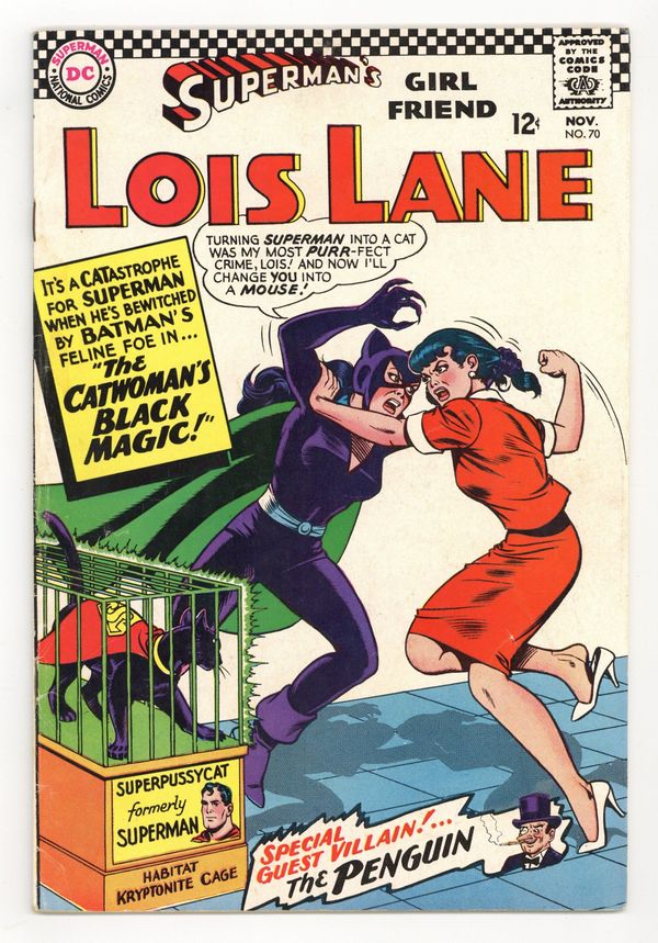 Starts Apr 4 1st Silver Age appearance of Catwoman (see next issue for 2nd appearance & Detective Comics for #369 for 3rd appearance). Cover art by Kurt Schaffenberger. The Catwoman's Black Magic! [Part I], script by Leo Dorfman, art by Kurt Schaffenberger; When the Penguin escapes from prison, Lois tries to track him down but she is kidnapped by Catwoman instead, who hypnotizes her into acting as the villainess's double. House ad for Plastic Man #1. The Catwoman Gets the Bird! (Part II), script by Leo Dorfman, art by Kurt Schaffenberger; The Penguin confronts Lois, thinking she's Catwoman, but Superman, Batman, and Robin show up to take the Penguin back to prison. Superman's Cat-astrophe! (Part III); Catwoman takes Lois's place and tricks Superman into taking her to her lair, where she uses Circe's magic wand to turn him into a cat. Magic Photo Kit featuring Batman and Robin, pencils by Carmine Infantino, inks by Joe Giella. House ad for Justice League of America #48. GI Joe Club ad, art by Irv Novick. 36 Pages, Full Color. Cover price $0.12.
