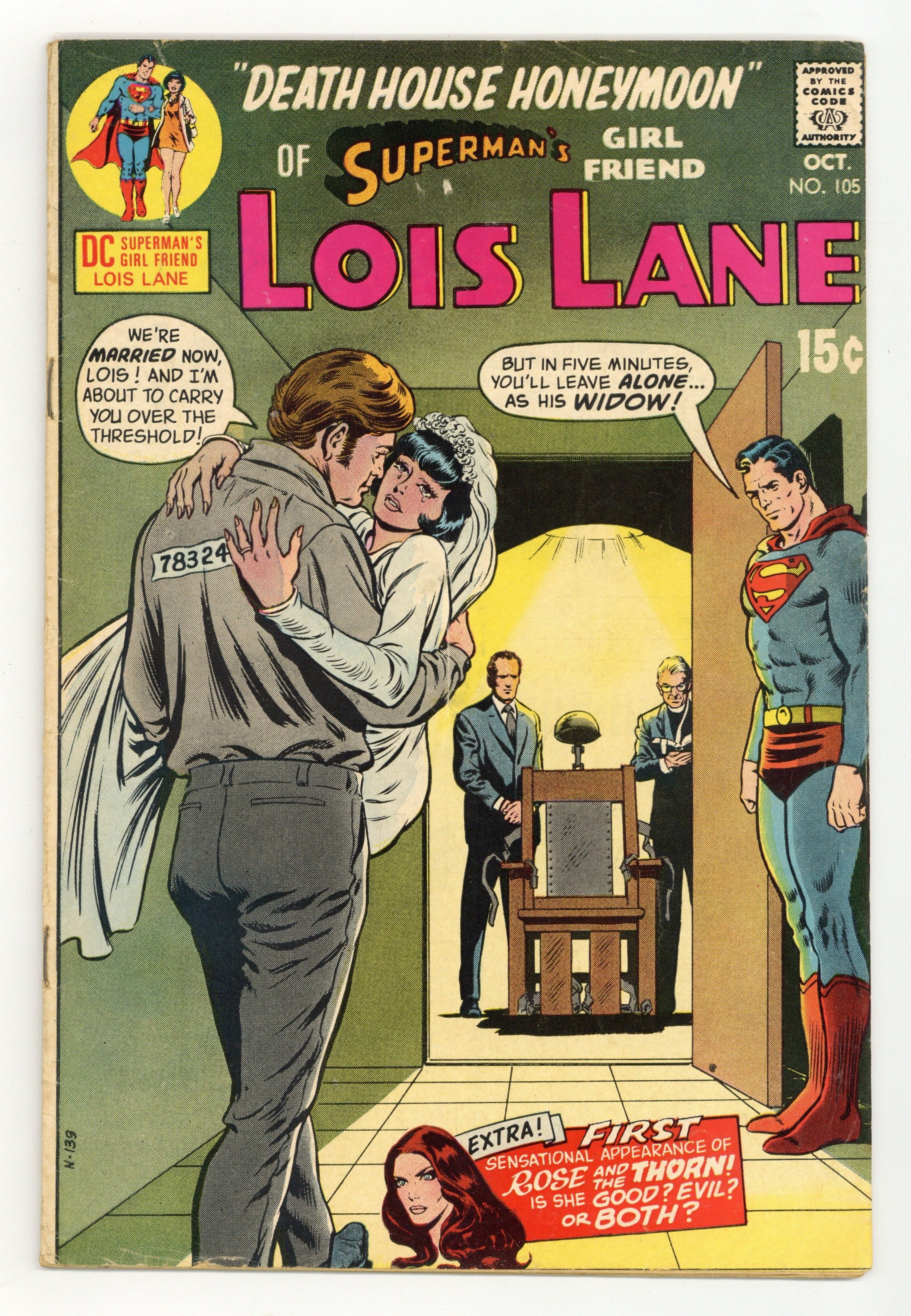 1st appearance and origin of Rose and Thorn. Cover pencils by Curt Swan, inks by Murphy Anderson. Death House Honeymoon!, script by Robert Kanigher, pencils by Art Saaf and Ross Andru, inks by Mike Esposito; Johnny Adonis, a murderer on death row, asks Lois to marry him as his last request. Night of the Thorn, script by Robert Kanigher, pencils by Ross Andru, inks by Mike Esposito; Rose Forrest becomes the Thorn to avenge her father's murder by The 100. 36 Pages, Full Color. Cover price $0.15.