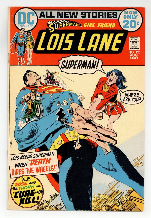 Tags: Superman$14.00Cover by Bob Oksner. Written by Robert Kanigher and Cary Bates. Art by John Rosenberger, Don Heck and Vince Colletta. Lois is menaced by a motorcycle gang with a hidden connection to murderous war criminals from World War II in "Death Rides the Wheels!" by Robert Kanigher, John Rosenberger and Vince Colletta. Starring Lois Lane, Superman (Clark Kent), Spike Helmet Gang, Professor Messerschmied, Kristin Cutler, Julie Spence and Marsha Mallow. Plus: When Rose is injured in a car accident, she is taken by a phony ambulance to the laboratory of a mad undertaker who plans to kill her for research purposes in the Rose and Thorn back-up story "Cure...or Kill!" by Cary Bates and Don Heck. Starring Thorn (Rose Forrest), Detective Danny Stone, Dr. Basil Shalock and Bronto. 36 Pages, Full Color. Cover price $0.20.