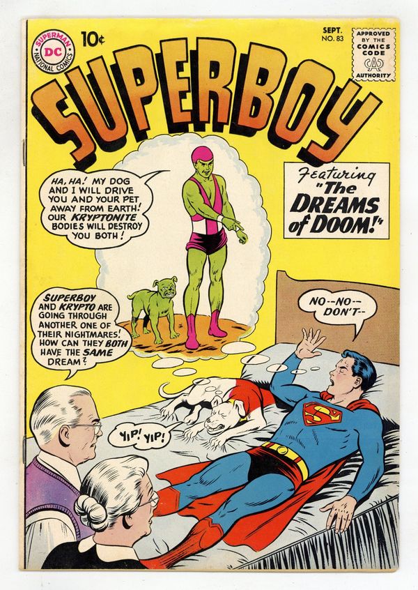 Origin and 1st appearance of Kryptonite Kid. Cover pencils by Curt Swan, inks by Stan Kaye. The Dreams of Doom, script by Jerry Siegel, art by George Papp; Superboy meets a young boy with the power to turn anything into Kryptonite. The Old Maid of Smallville!, script by Jerry Siegel, art by Al Plastino; Superboy helps an old maid school teacher break out of her shell. The Invasion of Krypton!, script by Jerry Siegel, art by George Papp; Baby Kal-El uses Jor-el's anti-gravity ray to defeat an invasion of Krypton. 36 Pages, Full Color. Cover price $0.10.