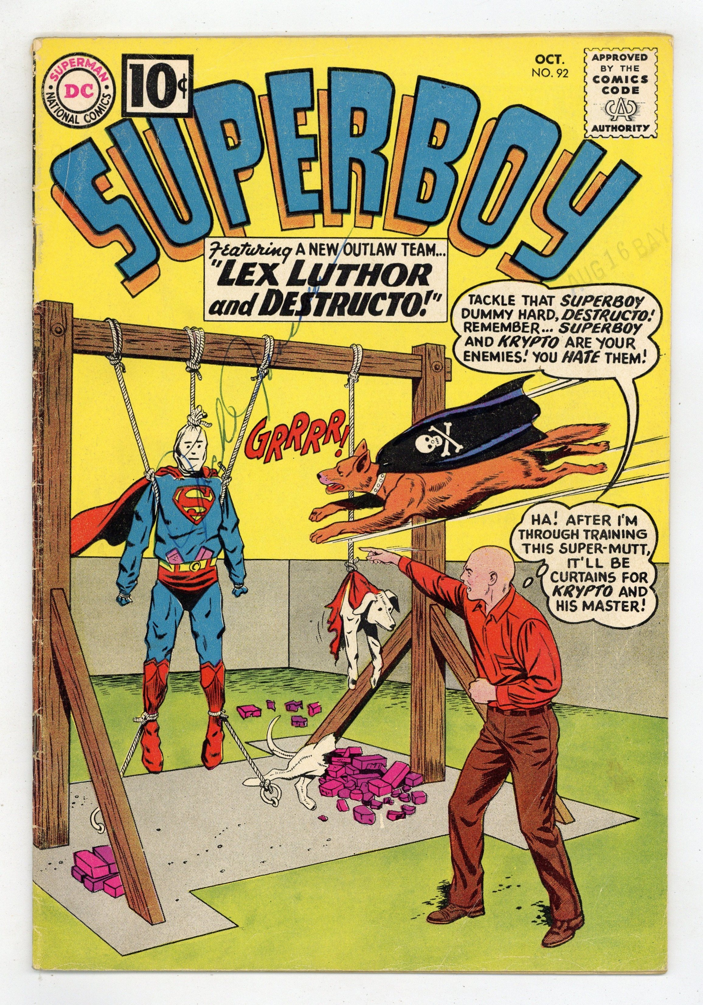 Last 10-cent cover price. Cover pencils by Curt Swan, inks by Stan Kaye. "Superboy Meets Ben Hur!", pencils by Curt Swan, inks by Stan Kaye; Superboy journeys back in time to meet Ben-Hur and save Professor Lang's job. Ollie humor page by Henry Boltinoff. "Krypto's Arch-Enemy!" starring Luthor and Destructo (Luthor's dog), script by Otto Binder, art by George Papp; Luthor's origin retold; Luthor accidentally gives his dog super-powers and then uses him to disgrace Krypto. Giant Superman Annual ad. 36 Pages, Full Color. Cover price $0.10.