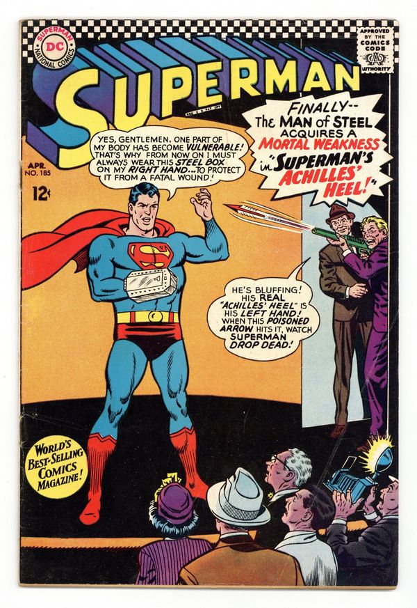 Tags: Superman$28.00Cover pencils by Curt Swan, inks by George Klein. Superman's Achilles' Heel!, art by Pete Costanza; The Man of Steel resorts to wearing a steel box on his right hand after Red Kryptonite gives him a vulnerable "Achilles' Heel". Target Superman! [part 1], art by Jim Mooney; Rich Dolores Rivera uses her fortune to try to snare Superman. The Irresistible Clark Kent! [part 2]; Vol-Don of the Look-Alike Squad of Kandor impersonates Clark Kent to help Superman. 36 Pages, Full Color. Cover price $0.12.