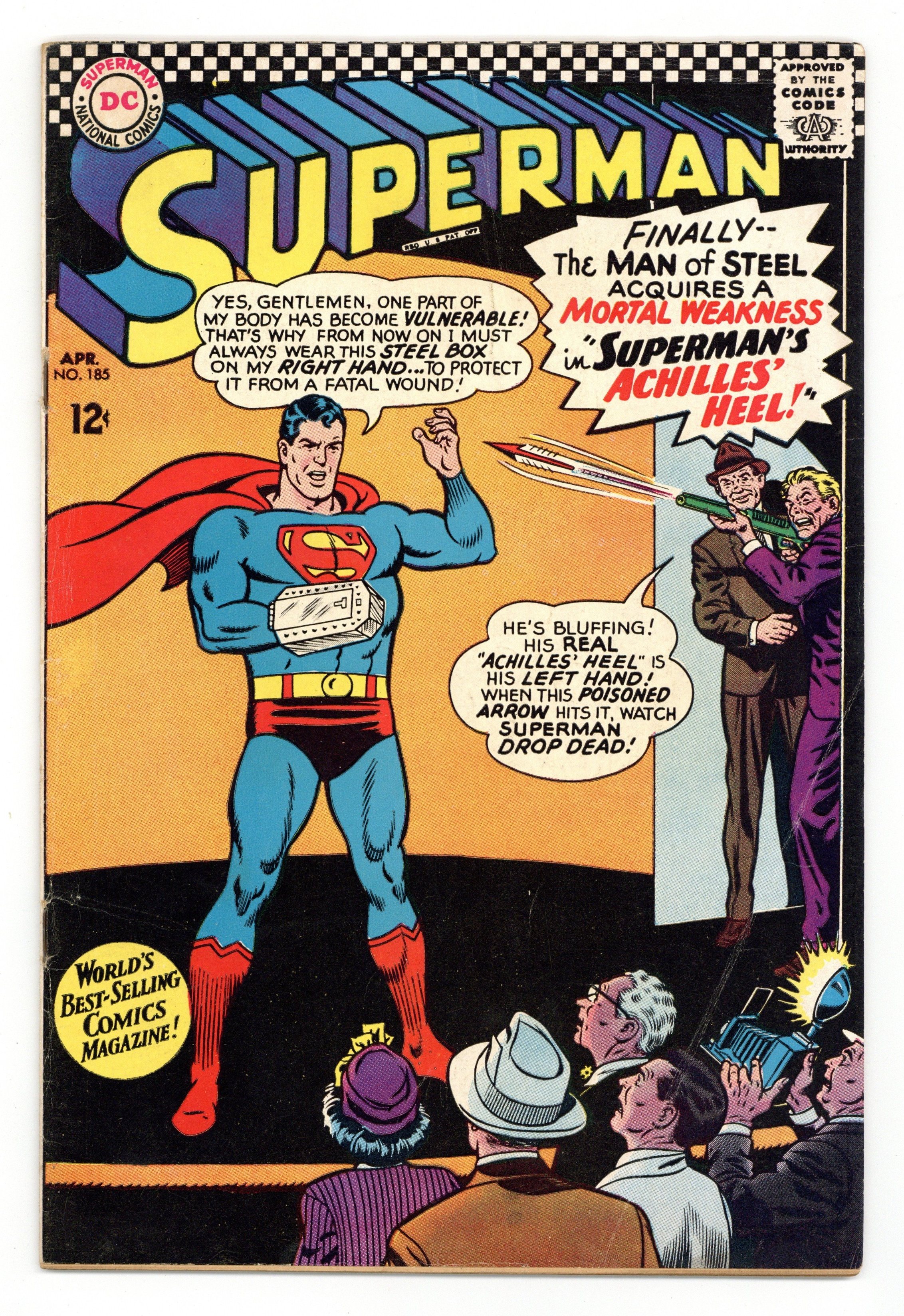 Tags: Superman$20.00Cover pencils by Curt Swan, inks by George Klein. Superman's Achilles' Heel!, art by Pete Costanza; The Man of Steel resorts to wearing a steel box on his right hand after Red Kryptonite gives him a vulnerable "Achilles' Heel". Target Superman! [part 1], art by Jim Mooney; Rich Dolores Rivera uses her fortune to try to snare Superman. The Irresistible Clark Kent! [part 2]; Vol-Don of the Look-Alike Squad of Kandor impersonates Clark Kent to help Superman. 36 Pages, Full Color. Cover price $0.12.