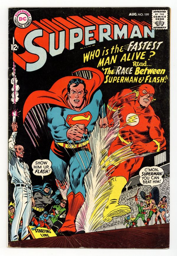 1st Superman vs. Flash race. Cover pencils by Carmine Infantino, inks by Murphy Anderson. Superman's Race With the Flash!, script by Jim Shooter, pencils by Curt Swan, inks by George Klein; a very close race by the two fastest super-heroes; brief Justice League appearance; the first Superman/Flash race. 36 Pages, Full Color. Cover price $0.12.