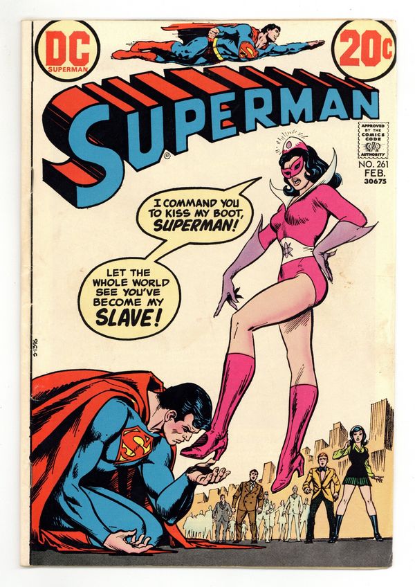 Tags: Superman$85.00Cover art by Nick Cardy. Slave of Star Sapphire!, script by Cary Bates, pencils by Curt Swan, inks by Murphy Anderson; Carol Ferris thinks Superman is attacking Green Lantern, so she becomes Star Sapphire to fight him. 36 Pages, Full Color. Cover price $0.20.