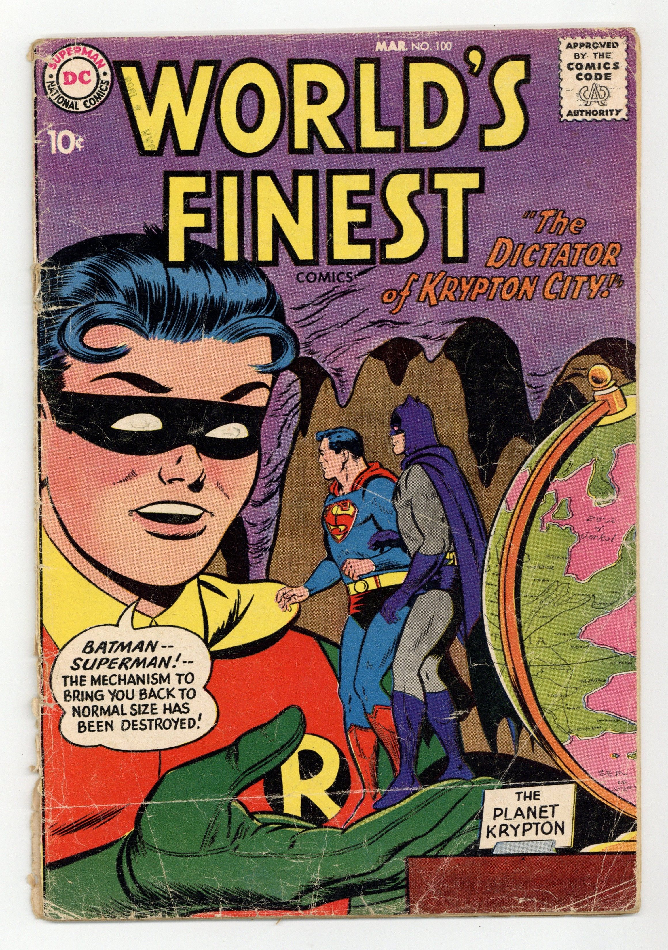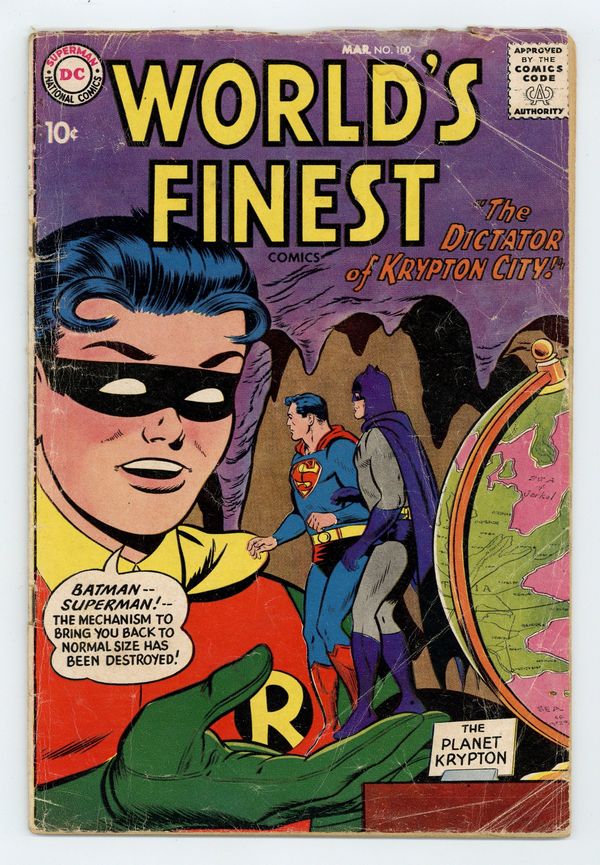 Cover pencils by Curt Swan, inks by Stan Kaye. The Dictator of Krypton City, script by Bill Finger, pencils by Dick Sprang, inks by Stan Kaye; Luthor shrinks himself and tricks Superman into leaving him in the Fortress, where he enters Krypton City [Kandor] and takes over. Mystery of the Vanishing Boys starring Tomahawk, art by Bob Brown. Case of the Green Error Clown starring Green Arrow, art by Lee Elias; Green Arrow and Speedy meet the Green Error, a clown who spoofs Green Arrow at the circus. Green Error's tools help them stop the robbers who stole the day's receipts. 36 Pages, Full Color. Cover price $0.10.