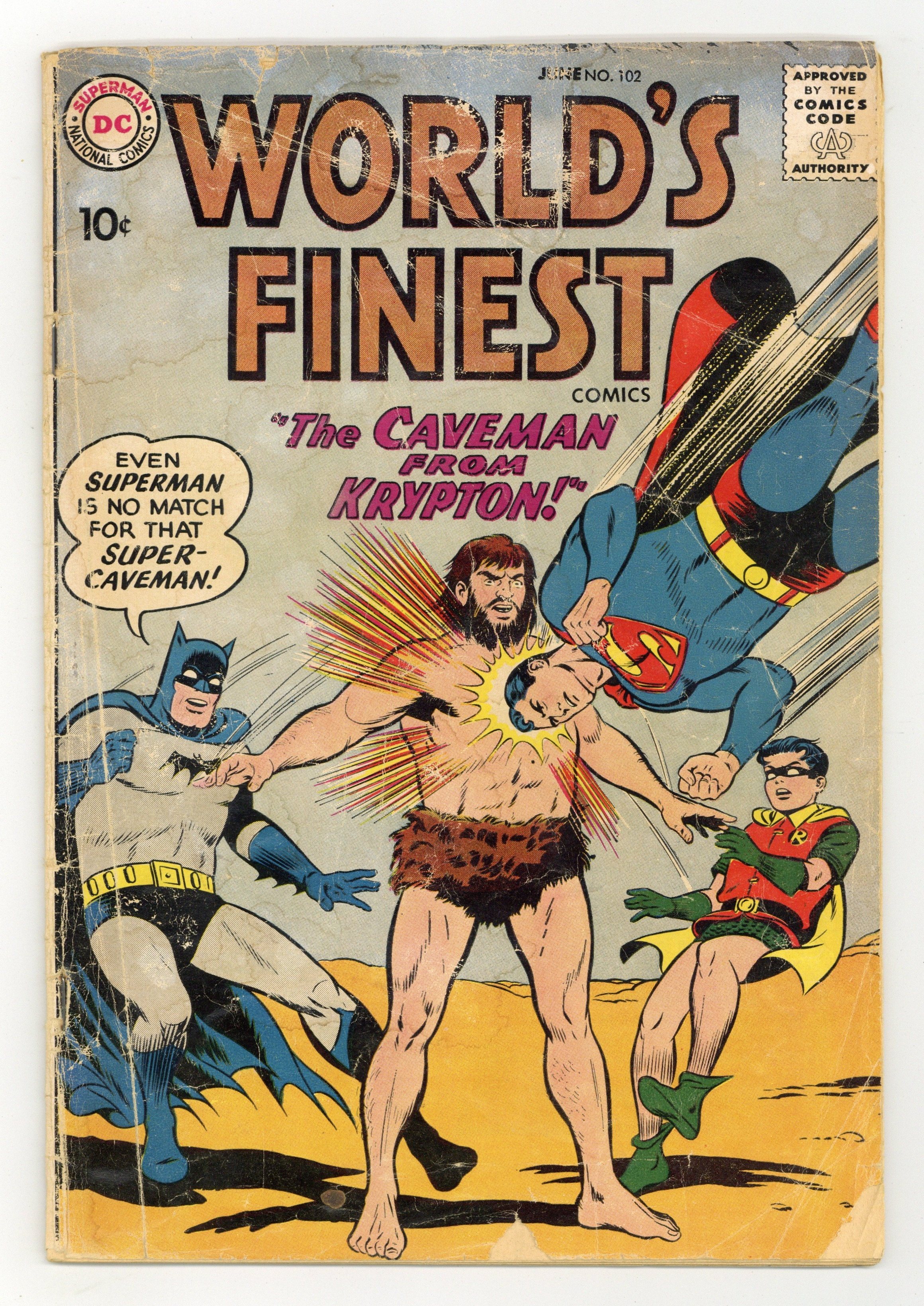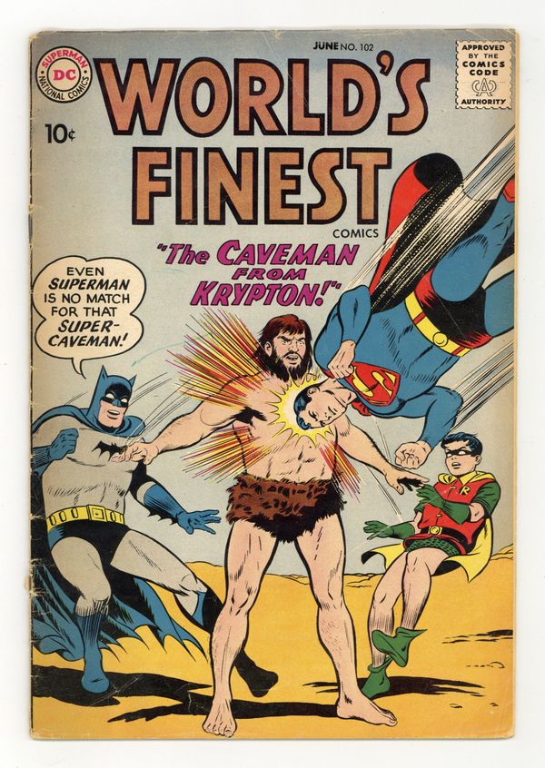 Cover pencils by Curt Swan, inks by Stan Kaye. The Caveman From Krypton, script by Bill Finger, pencils by Dick Sprang, inks by Sheldon Moldoff and Ray Burnley (splash only); A meteor crashes in the country and a caveman from ancient Krypton emerges. Pete and his boss Jo-Jo try to use the caveman's powers to help them steal from banks, but are stopped by Superman, Batman and Robin. L'il Brontosaurus humor page by Henry Boltinoff. The Winged Space Raider starring Tommy Tomorrow, script by Arnold Drake, art by Jim Mooney. The Sound Searchers text story. Case of the Camouflage King!, script by Ed Herron, art by Lee Elias; Green Arrow must stop the Camouflage King from robbing the circus. 36 Pages, Full Color. Cover price $0.10.
