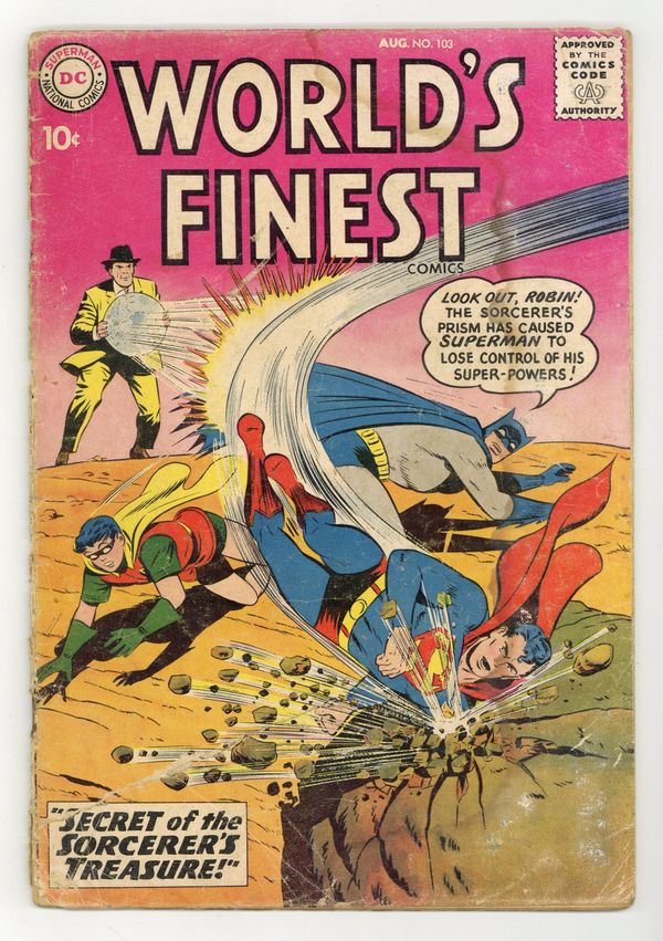 Tags: Superman$31.00Cover pencils by Curt Swan, inks by Stan Kaye. The Secret of the Sorcerer's Treasure starring Superman and Batman, script by Bill Finger, pencils by Dick Sprang, inks by Sheldon Moldoff; Atkins and Bork purchase a map that leads them to an ancient sorcerer's weapons. Tips on Summer Fun! public service announcement starring Peter Porkchops, script by Jack Schiff, art by Rube Grossman. Little Pete humor page by Henry Boltinoff. The Menace of the Metal Monitor starring Tommy Tomorrow, script by Jack Miller, art by Jim Mooney. Challenge Of The Phantom Bandit starring Green Arrow, script by Bob Haney, art by Lee Elias; After stealing some chemicals from a professor, Joey Sanders becomes the Phantom Bandit, who can't be touched by Green Arrow and Speedy. 36 Pages, Full Color. Cover price $0.10.