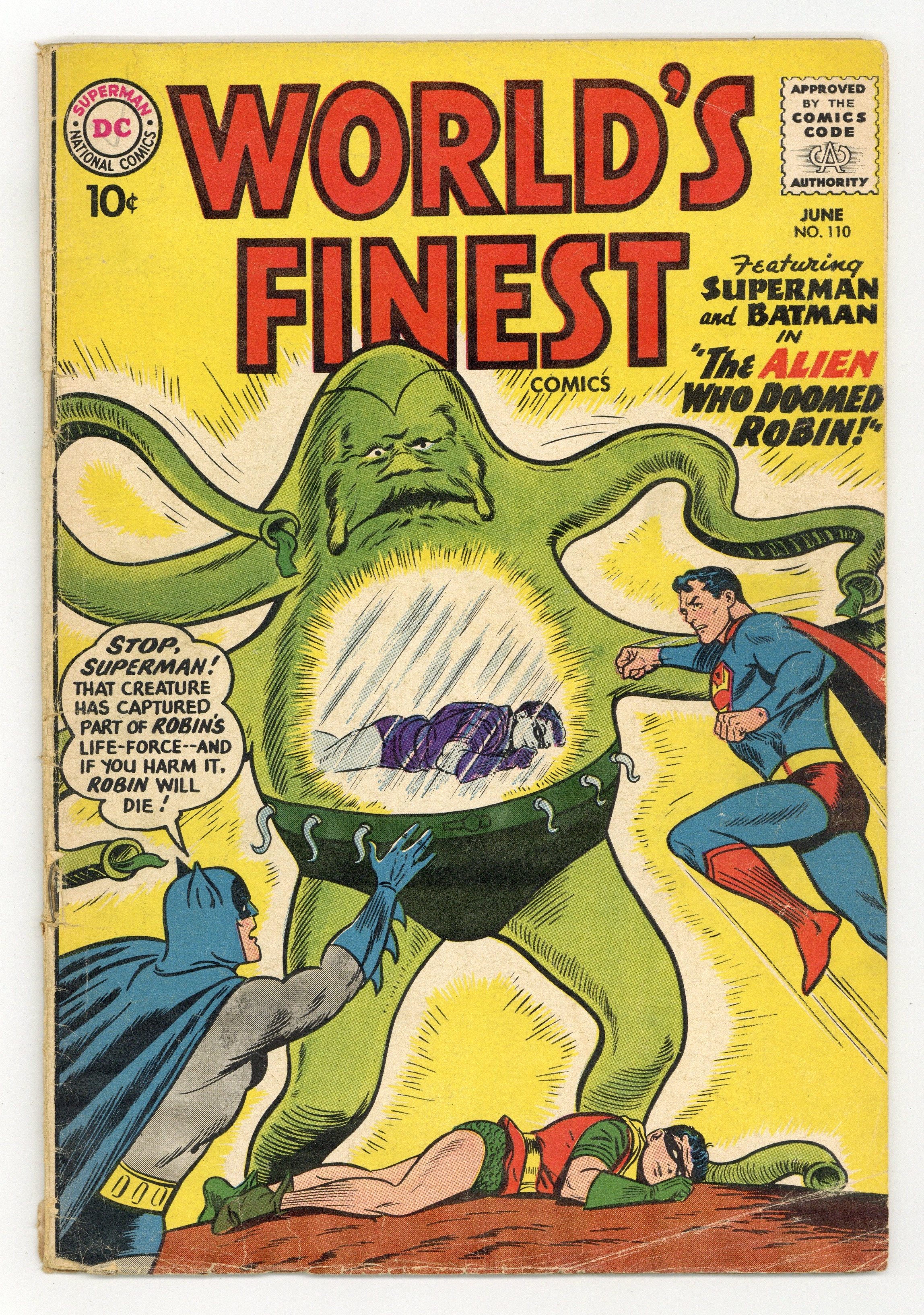 Cover pencils by Curt Swan, inks by Sheldon Moldoff. The Alien Who Doomed Robin starring Superman and Batman, script by Jerry Coleman, pencils by Dick Sprang, inks by Sheldon Moldoff; An alien arrives on Earth and starts shrinking buildings and stealing them; He plans to enlarge them on his homeworld and create a tourist attraction in space; Superman, Batman and Robin must stop him and return the shrunken buildings to their proper locations. Ollie humor page by Henry Boltinoff. The Robot Raiders starring Tommy Tomorrow, art by Jim Mooney. The Sinister Spectrum Man starring Green Arrow, script by Ed Herron, art by Lee Elias; Green Arrow and Speedy must find a way to stop the Spectrum Man and his gang of thieves. 36 Pages, Full Color. Cover price $0.10.