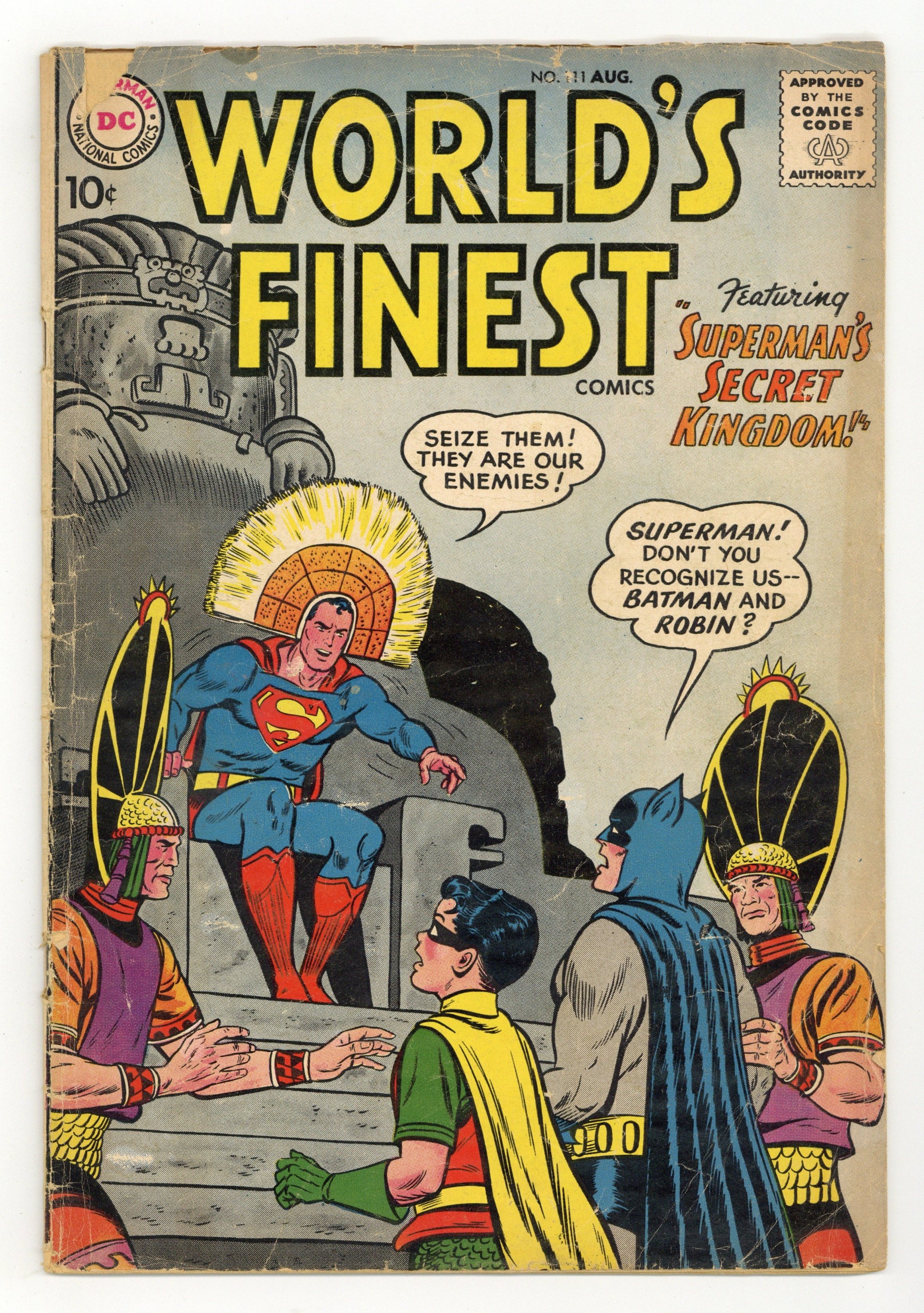 Cover pencils by Curt Swan, inks by Sheldon Moldoff. Superman's Secret Kingdom starring Superman and Batman, script by Bill Finger, pencils by Dick Sprang, inks by Sheldon Moldoff; The force of a volcanic eruption gives Superman amnesia. He finds himself in a forgotten Aztec city and becomes the king of the inhabitants; When Batman and Robin go in search of him, they find the criminal Floyd Frisby who tries to convince Superman that Batman and Robin are really criminals. Ollie humor page by Henry Boltinoff. The Hermit of Titan starring Tommy Tomorrow, script by Jack Miller, art by Jim Mooney. Lend A Friendly Hand public service announcement starring Superman, script by Jack Schiff, pencils by Curt Swan, inks by Sheldon Moldoff. The Crimes of the Clock King starring Green Arrow, script by Ed Herron, art by Lee Elias; The Clock King is successful in a series of crimes, besting Green Arrow and Speedy. 36 Pages, Full Color. Cover price $0.10.