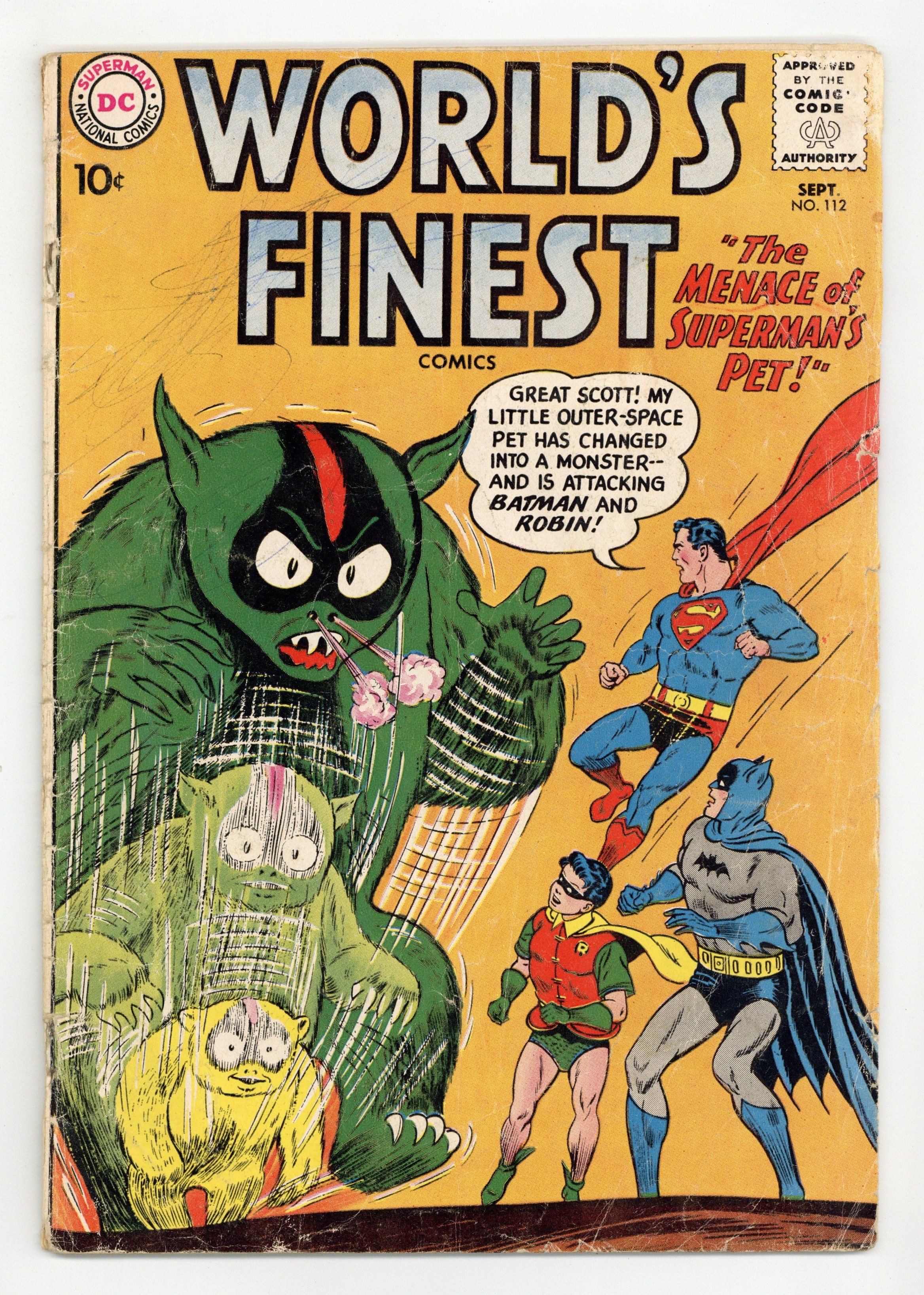 Cover pencils by Curt Swan, inks by John Forte. The Menace of Superman's Pet starring Superman and Batman, script by Jerry Coleman, pencils by Dick Sprang, inks by Sheldon Moldoff; While traveling thru space Superman picks up a small creature; When he returns to Earth the new "pet" causes problems for Superman, Batman and Robin while they are trying to catch a group of criminals called The Wreckers. Bike Safety = Bike Fun public service announcement, script by Jack Schiff, art by Bernard Baily. The Spy In The Arrow-Cave starring Green Arrow, script by Ed Herron, art by Lee Elias; An escaped convict hides out in Green Arrow's secret hide out. The Planeteer Bandit starring Tommy Tomorrow, art by Jim Mooney. 36 Pages, Full Color. Cover price $0.10.