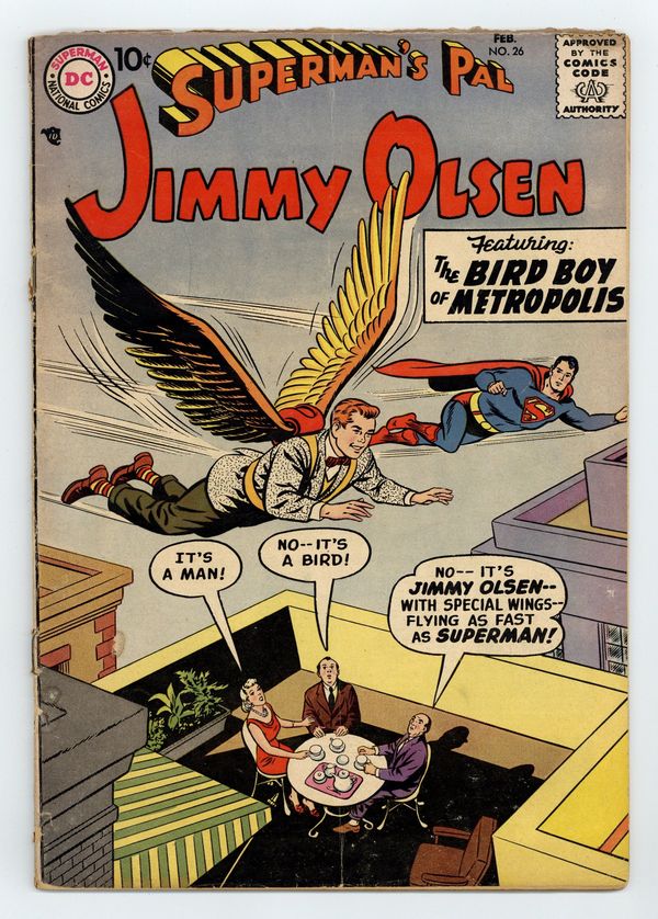 Cover pencils by Curt Swan, inks by Stan Kaye. The World's Heavy Weight Champ; Jimmy becomes super heavy when he is around Superman. Jimmy Olsen, Foreign Correspondent; Jimmy and Superman face a firing squad in the kingdom of Hoxana. The Birdboy of Metropolis; Jimmy thinks wings can make him fly. Scripts by Otto Binder, pencils by Curt Swan, inks by Ray Burnley. Little Pete humor page by Henry Boltinoff. The First Photograph article. 36 Pages, Full Color. Cover price $0.10.
