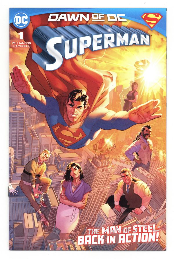 Written by Joshua Williamson. Art by Jamal Campbell. Cover by Jamal Campbell. ITS THE DAWN OF DC! Superman has returned to Metropolis and his greatest enemy Lex Luthor is finally behind bars. The future of the Superman family has never been brighter! As Clark Kent settles back into his life, iconic and new enemies erupt from the shadows to strike down the Man of Steel! But waiting in the wings to back up Big Blue is...Supercorp?! What secret project has Lex given to Superman?! A hero is only as good as their villains will be put to the test in this brand-new oversize #1 featuring comics' greatest superhero by DC Comics architect Joshua Williamson and award-winning superstar artist Jamal Campbell! 32 pages, full color. Rated T+ Cover price $4.99.