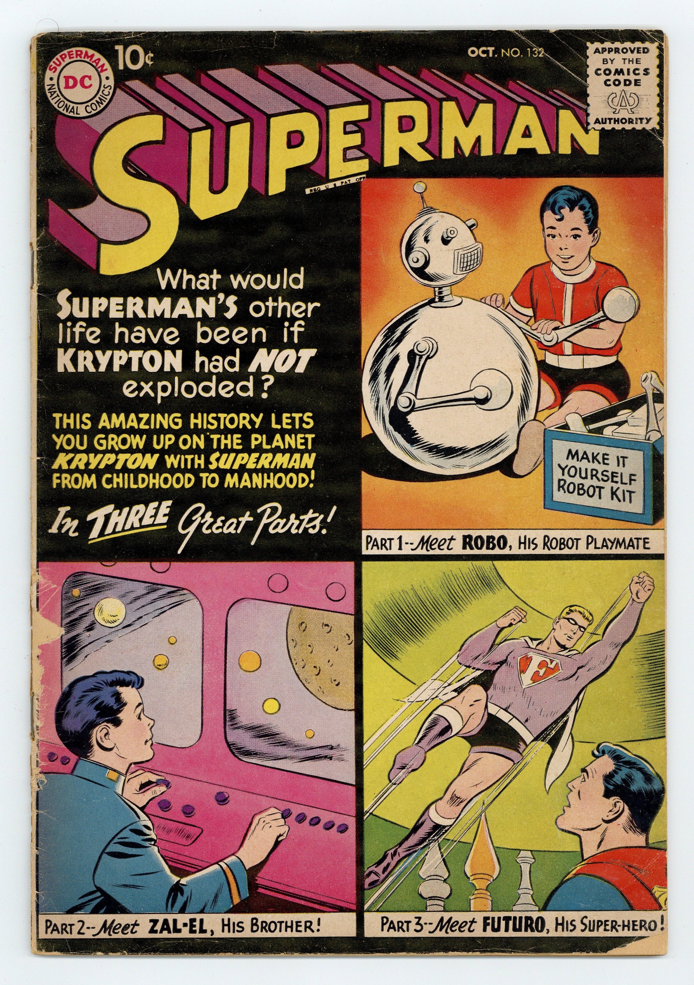 Starts Mar 16 Cover pencils by Curt Swan, inks by Stan Kaye. Superman's Other Life, Part 1: Krypton Lives On, script by Otto Binder, pencils by Wayne Boring, inks by Stan Kaye. Superman's Other Life, Part 2: Futuro, Super-Hero of Krypton; imaginary story done as computer projection. Superman's Other Life, Part 3: The Superman of Two Worlds. This three-part story answers the question, what would Superman's other life have been like if Krypton had not exploded? 36 Pages, Full Color. Cover price $0.10.