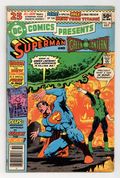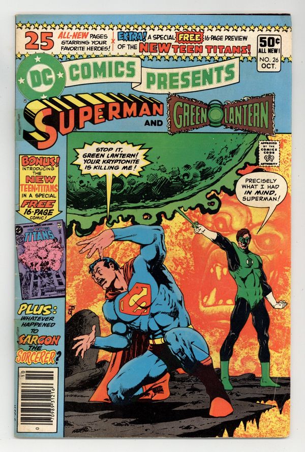 Tags: Superman$137.00Newsstand Edition. 1st appearance of the New Teen Titans in preview story; 1st appearances of Raven, Cyborg and Starfire. Cover by Jim Starlin. Stories by Jim Starlin, Marv Wolfman and Bob Rozakis. Art by Jim Starlin, George Pérez, José Delbo, Steve Mitchell, Dick Giordano and Kim DeMulder. N'Gon is attempting to gain power by taking it from other super-beings, but Superman and Green Lantern combine forces to imprison N'Gon in "Between Friend and Foe!" by Jim Starlin (plot and pencils), Marv Wolfman (script) and Steve Mitchell (inks). Characters in this story: Green Lantern [Hal Jordan]; Superman [Clark Kent]; Green Lantern [Archon Z'Gmora]; N'Gon (villain); Archie Jones. Plus: Raven uses her powers to enter Dick Grayson's dreams to show him a scene from the not-too-distant future of the new Teen Titans team battling to save the world from an other-dimensional protoplasmic creature in "Where Nightmares Begin!" by Marv Wolfman, George Pérez and Dick Giordano. Characters in this story: Teen Titans [Changeling [Garfield Logan] (introduction as Changeling); Cyborg [Victor Stone] (introduction); Kid Flash [Wally West]; Raven (introduction); Robin [Dick Grayson]; Starfire [Koriand'r] (introduction); Wonder Girl [Donna Troy]]; Silas Stone (introduction); an other-dimensional protoplasm (villain). Story continues in New Teen Titans (1980) (Tales of ...) #1. Also: The Matter Master attempts to steal the Ruby of Life but Sargon stops him in the back-up story "Whatever Happened to Sargon the Sorcerer?" by Bob Rozakis, José Delbo and Kim DeMulder. Characters in this story: Justice League of America [The Atom [Ray Palmer] (flashback); Batman [Bruce Wayne] (flashback); The Flash [Barry Allen] (flashback); Green Arrow [Oliver Queen] (flashback); Hawkman [Katar Hol/Carter Hall] (flashback); Superman [Clark Kent] (flashback); Wonder Woman [Diana Prince] (flashback)]; The Matter Master [Mark Mandrill] (villain); Sargon the Sorcerer [John Sargent]. And: Hawkman vs. Golden Raven in 1-page Hostess Fruit Pies ad "She's No Angel" with pencils by Curt Swan. 48 pages, full color. Cover price $0.50.