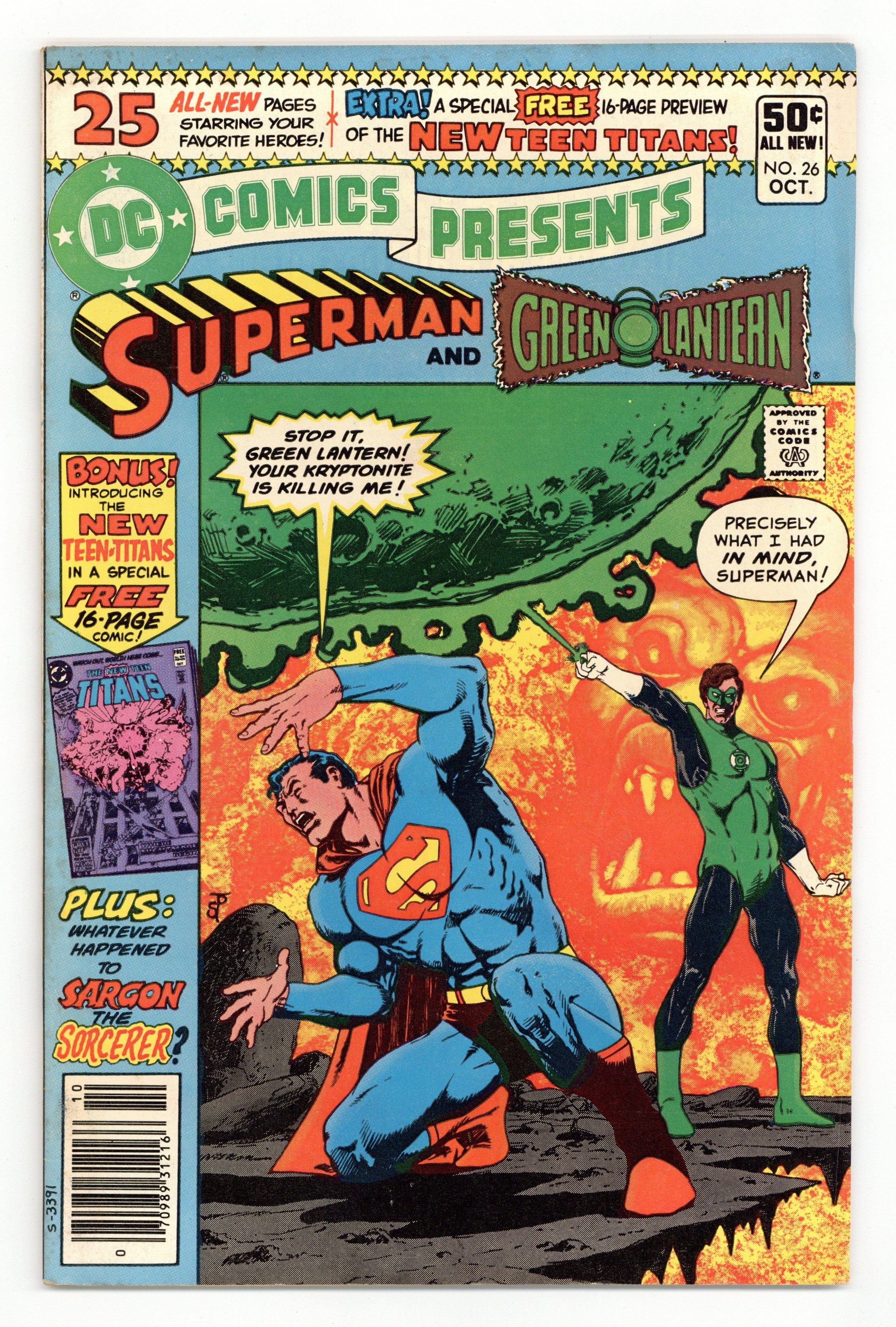 Newsstand Edition. 1st appearance of the New Teen Titans in preview story; 1st appearances of Raven, Cyborg and Starfire. Cover by Jim Starlin. Stories by Jim Starlin, Marv Wolfman and Bob Rozakis. Art by Jim Starlin, George Pérez, José Delbo, Steve Mitchell, Dick Giordano and Kim DeMulder. N'Gon is attempting to gain power by taking it from other super-beings, but Superman and Green Lantern combine forces to imprison N'Gon in "Between Friend and Foe!" by Jim Starlin (plot and pencils), Marv Wolfman (script) and Steve Mitchell (inks). Characters in this story: Green Lantern [Hal Jordan]; Superman [Clark Kent]; Green Lantern [Archon Z'Gmora]; N'Gon (villain); Archie Jones. Plus: Raven uses her powers to enter Dick Grayson's dreams to show him a scene from the not-too-distant future of the new Teen Titans team battling to save the world from an other-dimensional protoplasmic creature in "Where Nightmares Begin!" by Marv Wolfman, George Pérez and Dick Giordano. Characters in this story: Teen Titans [Changeling [Garfield Logan] (introduction as Changeling); Cyborg [Victor Stone] (introduction); Kid Flash [Wally West]; Raven (introduction); Robin [Dick Grayson]; Starfire [Koriand'r] (introduction); Wonder Girl [Donna Troy]]; Silas Stone (introduction); an other-dimensional protoplasm (villain). Story continues in New Teen Titans (1980) (Tales of ...) #1. Also: The Matter Master attempts to steal the Ruby of Life but Sargon stops him in the back-up story "Whatever Happened to Sargon the Sorcerer?" by Bob Rozakis, José Delbo and Kim DeMulder. Characters in this story: Justice League of America [The Atom [Ray Palmer] (flashback); Batman [Bruce Wayne] (flashback); The Flash [Barry Allen] (flashback); Green Arrow [Oliver Queen] (flashback); Hawkman [Katar Hol/Carter Hall] (flashback); Superman [Clark Kent] (flashback); Wonder Woman [Diana Prince] (flashback)]; The Matter Master [Mark Mandrill] (villain); Sargon the Sorcerer [John Sargent]. And: Hawkman vs. Golden Raven in 1-page Hostess Fruit Pies ad "She's No Angel" with pencils by Curt Swan. 48 pages, full color. Cover price $0.50.