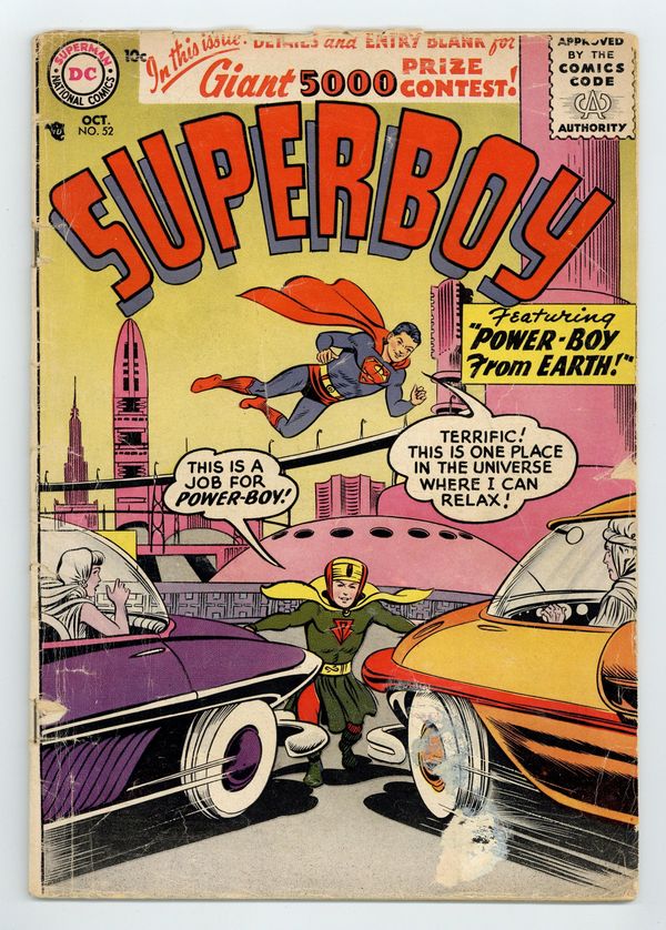 Cover pencils by Curt Swan, inks by Stan Kaye. The Heroine of Smallville, script by Otto Binder, art by John Sikela; Lana believes an amulet her father has given her has magical properties. How to Spend a Summer Week! public service announcement starring Binky, script by Jack Schiff, art by Win Mortimer. The Power-Boy from Earth, script by Otto Binder, pencils by Curt Swan; Superboy visits an asteroid where he meets a boy with super powers just like his. The Super-Robot, script by Otto Binder, pencils by Curt Swan; Two crooks try to peddle a Superboy robot that's supposed to have all his powers. 36 Pages, Full Color. Cover price $0.10.