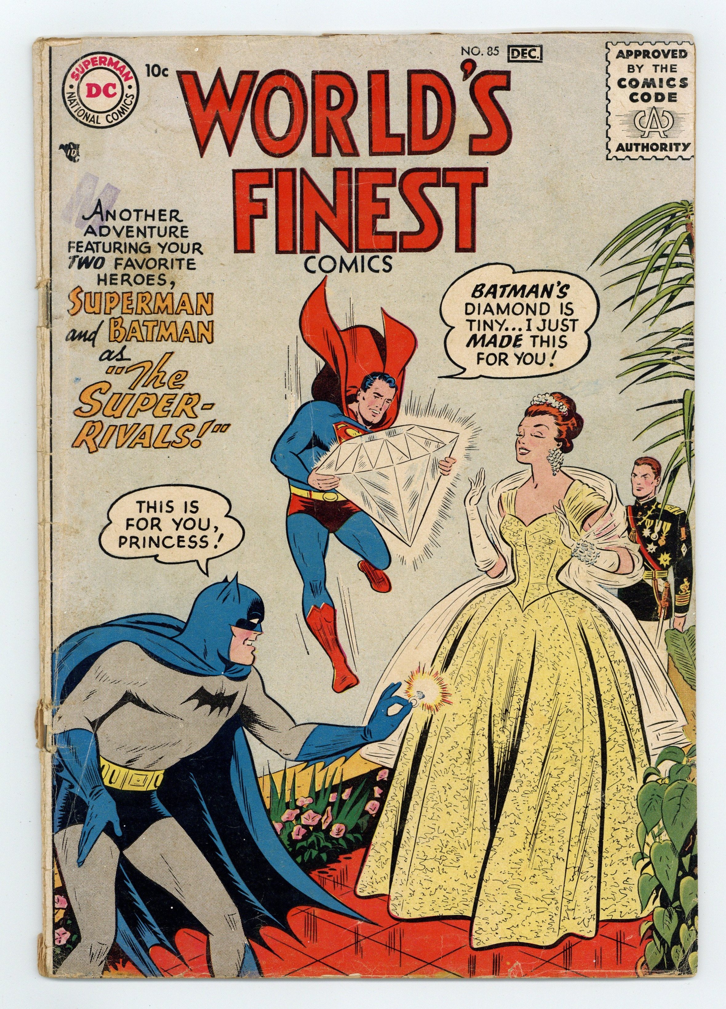 Cover pencils by Dick Sprang, inks by Stan Kaye. The Super-Rivals, script by Edmond Hamilton, pencils by Curt Swan (splash) and Dick Sprang, inks by Curt Swan (Splash) and Stan Kaye; When Princess Varina comes to America, Batman and Superman seem to both have fallen in love with her and fight for her attention. The Frontier Destroyer starring Tomahawk, art by Fred Ray. Binky's Special Election Exhibit public service announcement starring Binky, script by Jack Schiff, art by Bob Oksner. I Hunted the Giant Turtles text story by Jack Miller [as Jerry Manson]. The Dangers from Tomorrow starring Green Arrow, art by George Papp. 36 Pages, Full Color. Cover price $0.10.