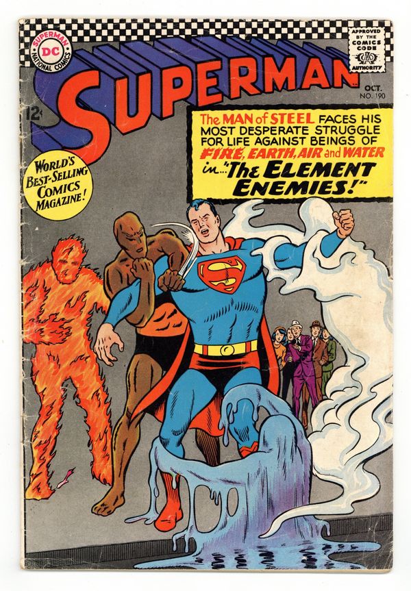 Tags: Superman$13.75Cover pencils by Curt Swan, inks by George Klein. Two-part story in which Superman battles beings of air, water, fire, and earth: The Four Element Enemies! [part 1], script by Jim Shooter, art by Wayne Boring. Fight With the Fearsome Foursome! [part 2]. Super-Turtle humor page by Henry Boltinoff. 36 Pages, Full Color. Cover price $0.12.