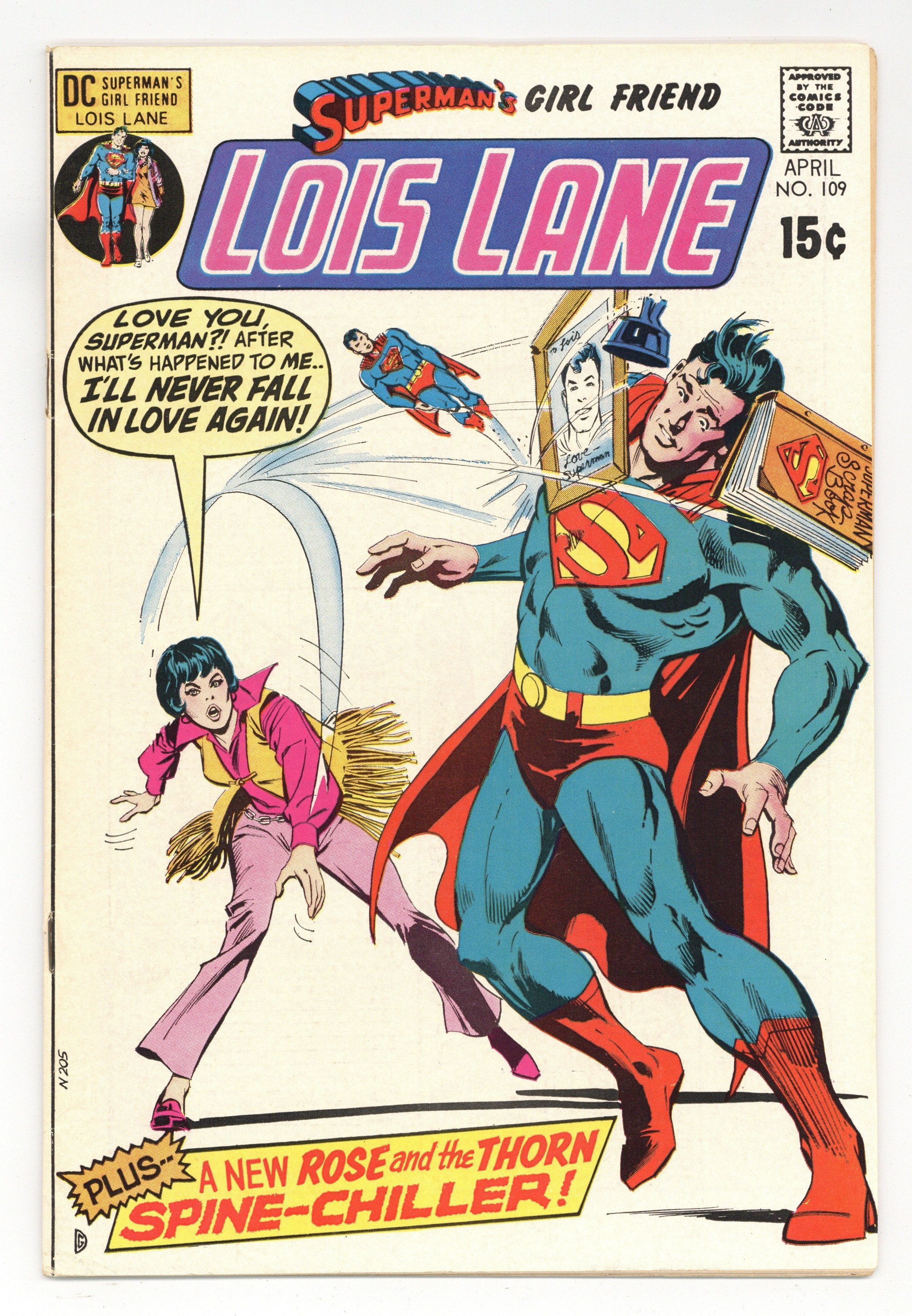 Cover art by Dick Giordano. I'll Never Fall in Love Again!, script by Cary Bates, pencils by Werner Roth, inks by Vince Colletta and Murphy Anderson (Superman heads); Professor Denison captures Lois and gives her an "emotional lobotomy" so she will no longer love Superman. The Mask of Death!, script by Robert Kanigher, pencils by Ross Andru, inks by Mike Esposito; Rose finds out the story of Selena Mason, an actress who was disfigured by a gangster from Selena's past. 36 Pages, Full Color. Cover price $0.15.