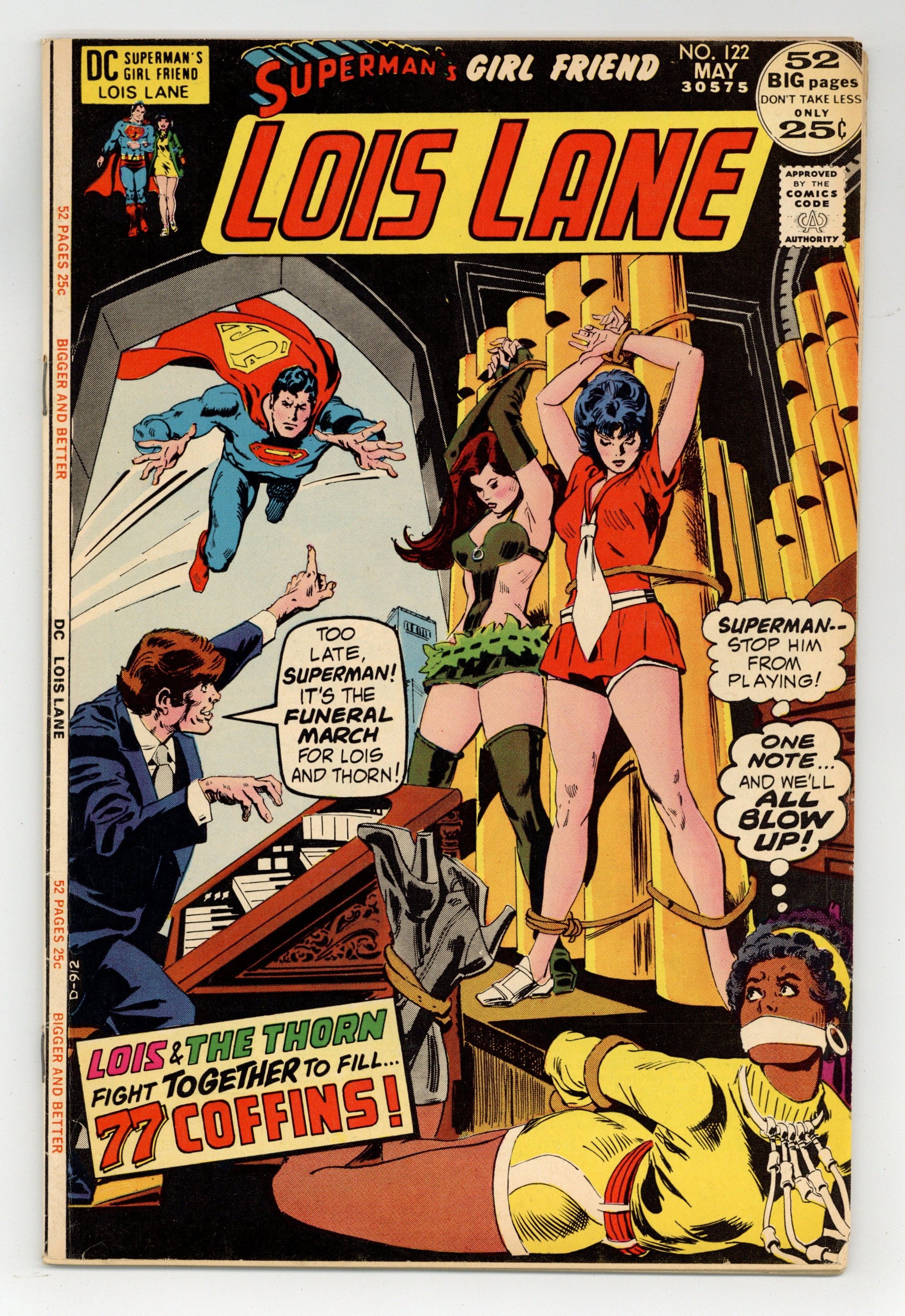 Tags: Superman$41.00Cover art by Bob Oksner. 77 Coffins!, pencils by John Rosenberger, inks by Vince Colletta and Murphy Anderson (Superman heads only); Lois and Superman help the Thorn execute her master plan to round up and arrest the remaining members of the 100. House ad for Tarzan #208, art by Joe Kubert. The Day Lois Lost Her Mind!, pencils by Curt Swan, inks by George Klein; While undercover on an assignment, Lois contracts amnesia and believes she is really Sheila Dexter, her false identity. Untitled Lois Lane, Girl Reporter story, script by Don Cameron, pencils by Ed Dobrotka, inks by George Roussos; Lois is taken prisoner by the Dover gang, which hopes to prevent her from testifying in court against Dover's swindling capers. 52 Pages, Full Color. Cover price $0.25.