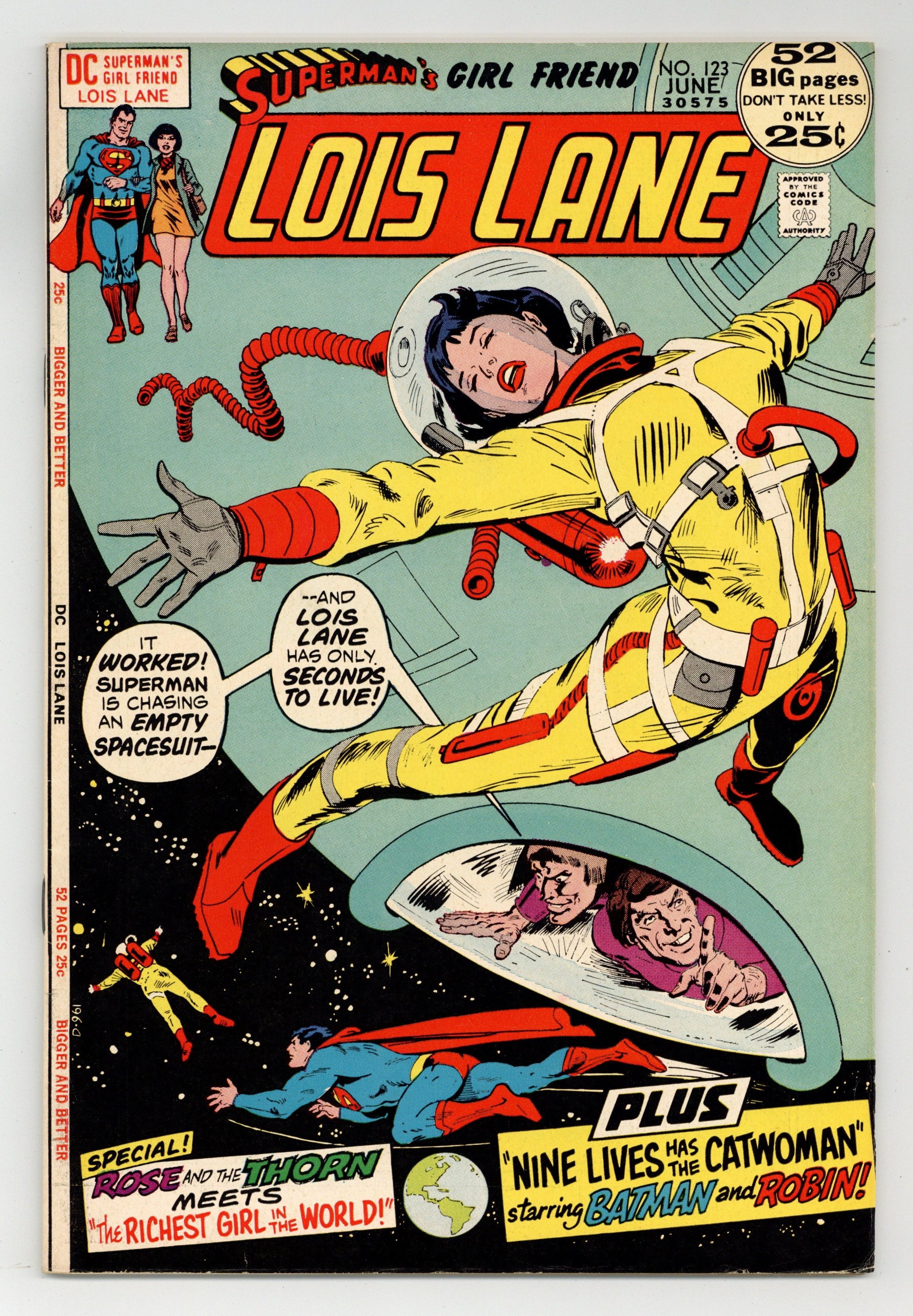 Cover art by Bob Oksner. The Ten Deadly Divisions of the 100, script by Cary Bates, pencils by John Rosenberger, inks by Vince Colletta and Murphy Anderson (Superman heads only); Superman and Lois learn from the recovered super-computer K.A.R.L. that the 100 is constantly replacing its arrested members. The Richest Girl in the World!, art by Don Heck; As Rose is looking for a job, she stumbles upon the kidnapping of a fashion designer and the Thorn must stop the crime. Nine Lives Has the Catwoman!, script by Bill Finger, pencils by Bob Kane, inks by Ray Burnley; The Catwoman escapes from jail and attempts to enhance her reputation by claiming that she really does have nine lives, like a cat, and can't be killed (reprinted from Batman #35). 52 Pages, Full Color. Cover price $0.25.