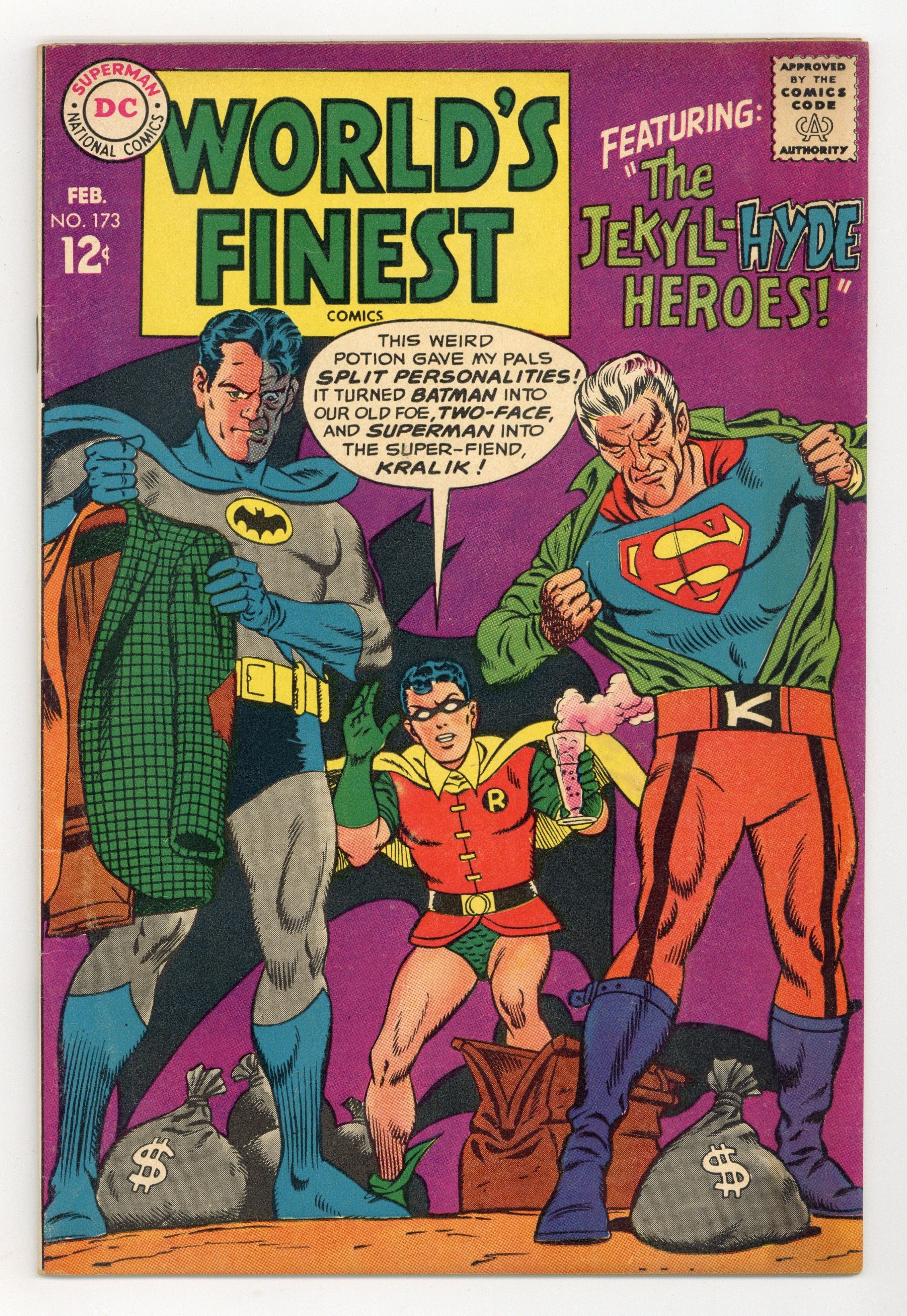 1st Silver Age appearance of Two-Face. Cover pencils by Curt Swan, inks by George Klein. The Jekyll-Hyde Heroes starring Superman and Batman, script by Jim Shooter, pencils by Curt Swan, inks by George Klein; Dr. Arron's Psyche-Distortor chemicals cause complete character reversal in Superman and Batman, turning them into their own worst enemies. The Super-Key to Fort Superman--Editors' Round Table: Superman, script by Jerry Coleman, pencils by Wayne Boring, inks by Stan Kaye; Someone has broken into Superman's Fortress of Solitude, so Superman searches the place for clues. Half-page ad with Neal Adams's pencils for the cover of Lois Lane 81. 36 Pages, Full Color. Cover price $0.12.