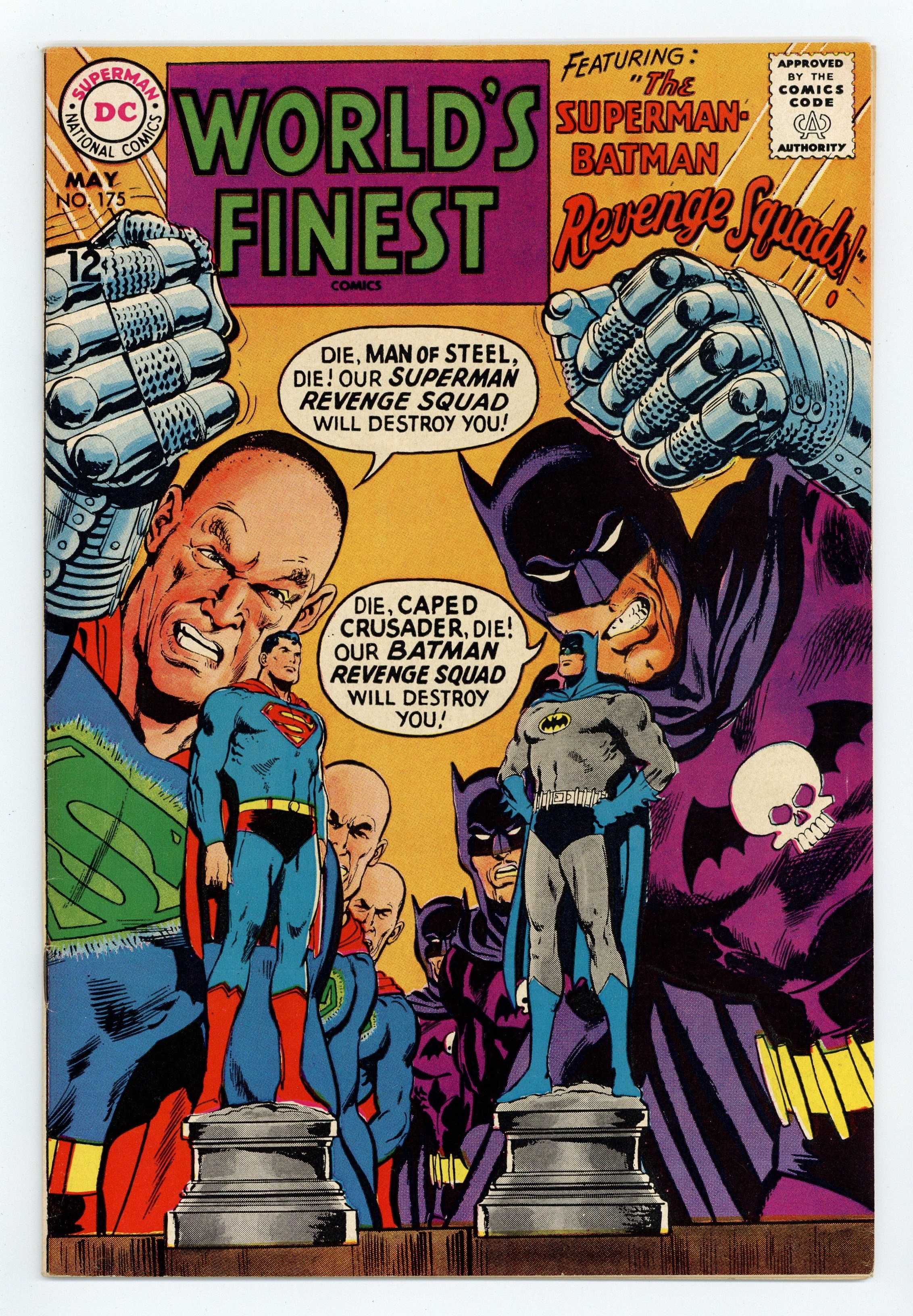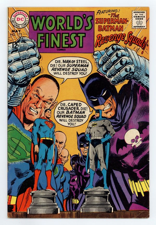 Cover art by Neal Adams. The Superman-Batman Revenge Squads, script by Leo Dorfman, art by Neal Adams; Once each year Superman and Jimmy Olsen bet their crime-fighting skills against Batman and Robin. But as the two heroes participate in various contests of skill, their respective Revenge Squads try to sabotage their opponents. The Strange Experiment of Dr. Erdel--Editors' Round Table: John Jones Manhunter From Mars, script by Joe Samachson, art by Joe Certa. 36 Pages, Full Color. Cover price $0.12.