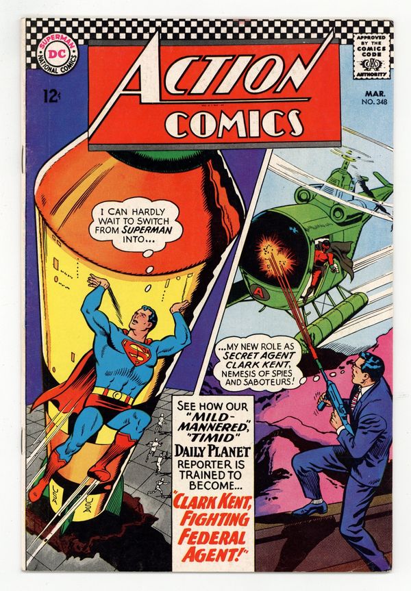 Cover pencils by Curt Swan, inks by George Klein. "Clark Kent, Fighting Federal Agent!", script by Jim Shooter, art by Wayne Boring; The FBI recruits Clark Kent as an undercover agent to pursue the Acid Master; Clark has to carry out the mission while concealing his Superman identity from everyone around him. Dial H for Hero ad. "The Assistant Supergirl!", script by Leo Dorfman, art by Jim Mooney; Supergirl acquires a robot roommate given to her by the grateful people of the planet Denek to assist her in her superhero career, but the robot turns out to be more of a problem than a help. Clark Kent Interviews Supergirl ad for Supergirl comics. 36 Pages, Full Color. $0.12 Cover price $0.12.