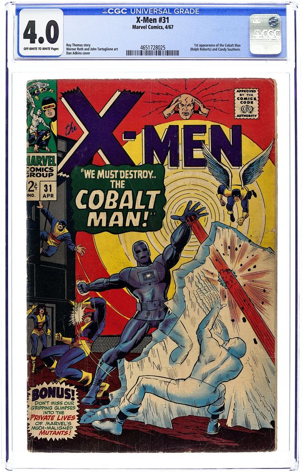 Ends Dec 22 9:49 PM CST Bid History 6 bids Current Bid $78 Your Secret Max Bid If you'd like to bid, please log in or register. Cover art by Dan Adkins. We Must Destroy...the Cobalt Man!, script by Roy Thomas, pencils by Werner Roth, inks by John Tartaglione; The X-Men are given a weekend off and head out for some fun; Cyke and Angel visit Jean in college and find her engaged with brothers Ted and Ralph Roberts; Ralph, who used to work for Tony Stark, takes them all to his lab where he puts on his new Cobalt Man suit to impress his brother; Going a little batty, Cobalt Man wrecks the lab and heads out to Stark Industries to confront his old boss; The X-Men assemble to battle him before his suit becomes radioactive and blows up; Iron Man and Juggernaut cameos.. 36 pgs. $0.12. Cover price $0.12.