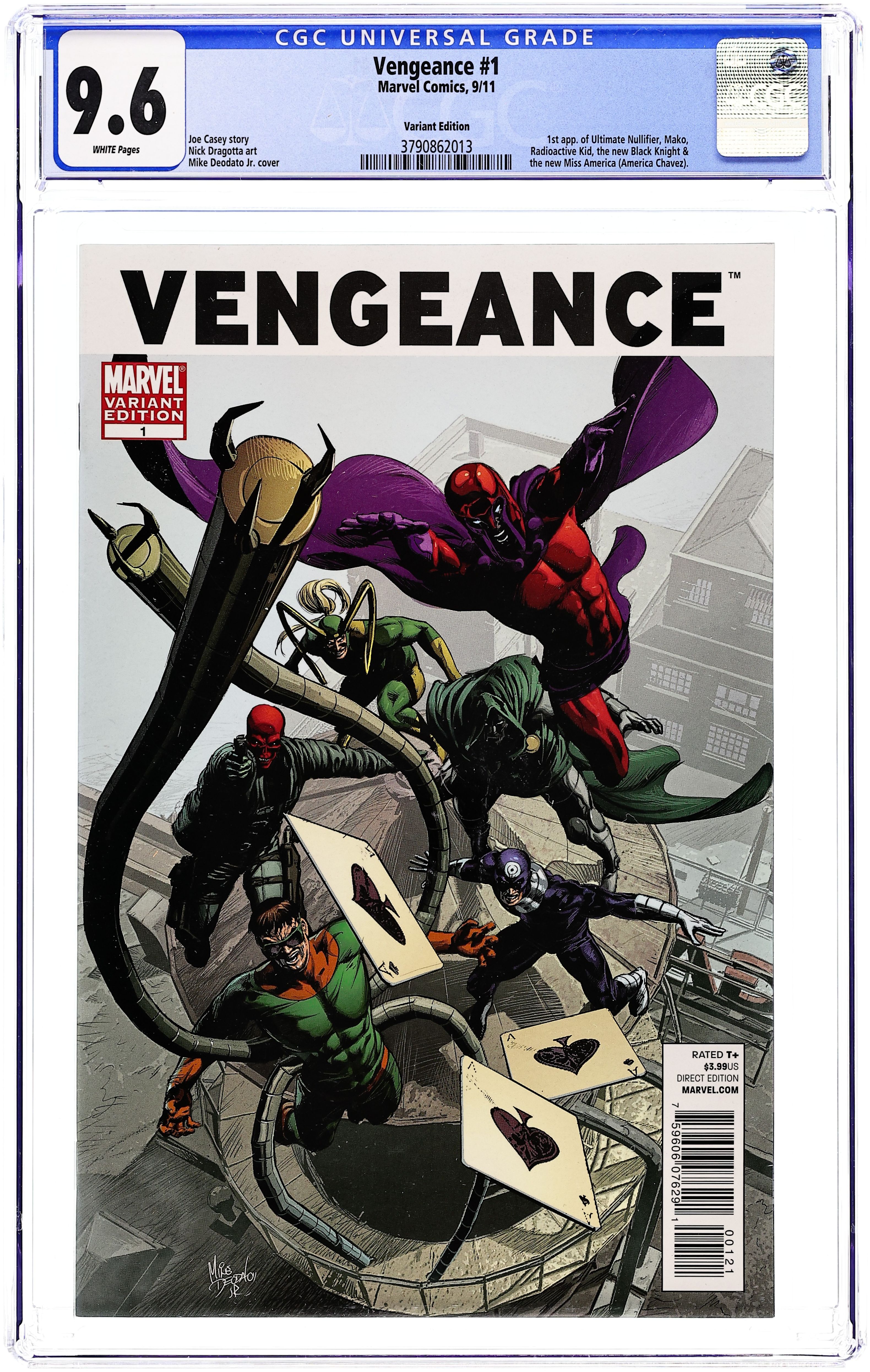 Limited 1 for 15 Villain Variant. Cover by Mike Deodato Written by JOE CASEY Penciled by NICK DRAGOTTA. 1st appearance of Miss America (America Chavez). A MOST EPIC EVIL EXPLORATION OF THE MARVEL U! When MAGNETO of the X-Men tries to rescue a young Mutant on the run, he accidently kicks off a series of events that will shake the very Marvel Universe to it's core! Who are the new TEEN BRIGADE?! Who are the Brotherhood and what do they want with the YOUNG MASTERS OF EVIL?! And how is the RED SKULL pulling the strings from beyond the grave? Joe Casey (AVENGERS: EARTH'S MIGHTIEST) joins Nick Dragotta?(FANTASTIC FOUR) for some major acts of VENGEANCE! 32 PGS./Rated T+ Cover price $3.99.