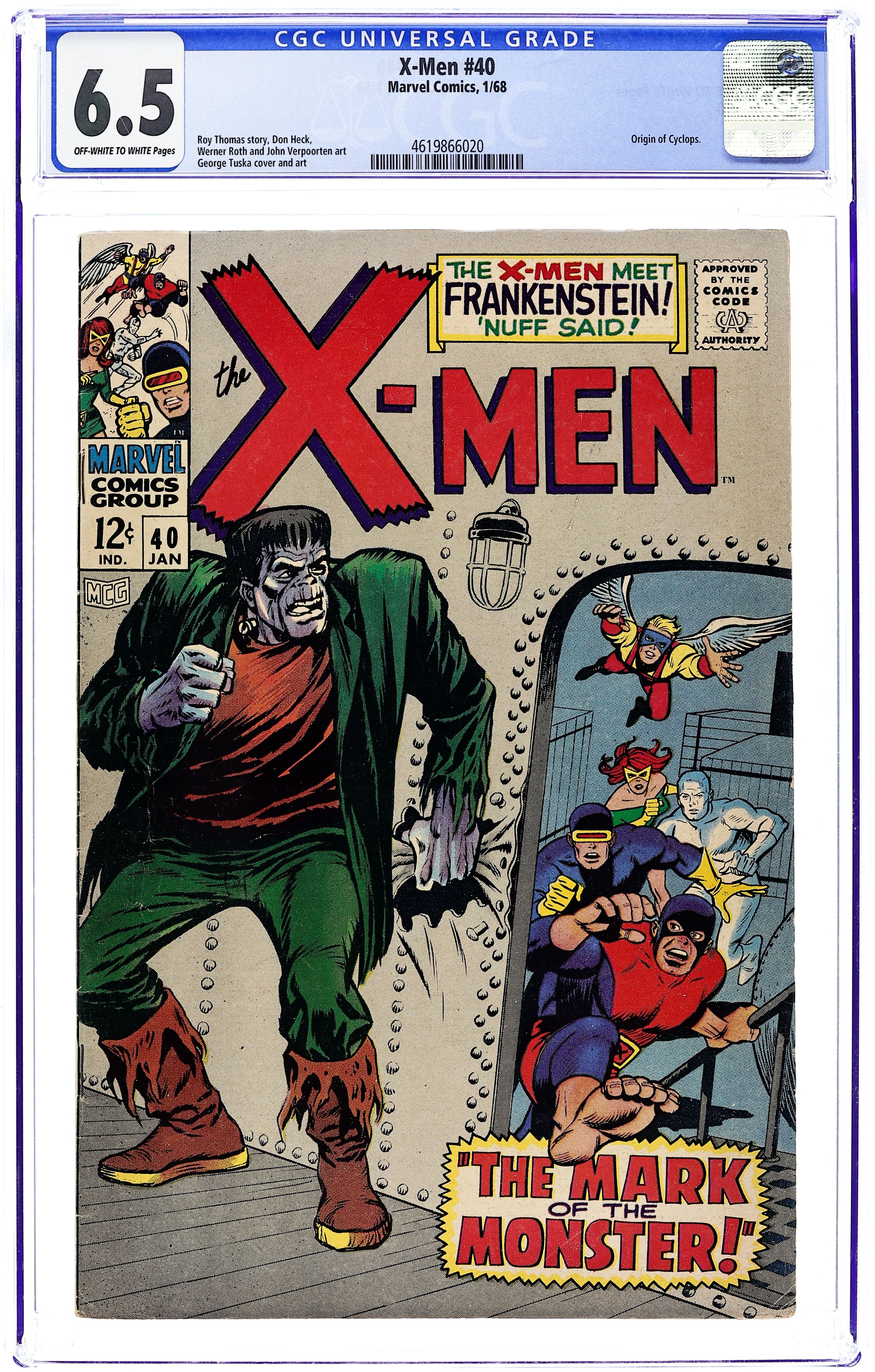 Cover art by George Tuska. The Mark of the Monster!, script by Roy Thomas, pencils by Don Heck, inks by George Tuska; the X-Men battle the Frankenstein monster, who is revealed SPOILER WARNING to be an android. The First Evil Mutant!--The Origins of the Uncanny X-Men, script by Roy Thomas, pencils by Werner Roth, inks by John Verpoorten; the origin of Jack ODiamond; Cyclops origin continued. 36 pgs. $0.12. Cover price $0.12.
