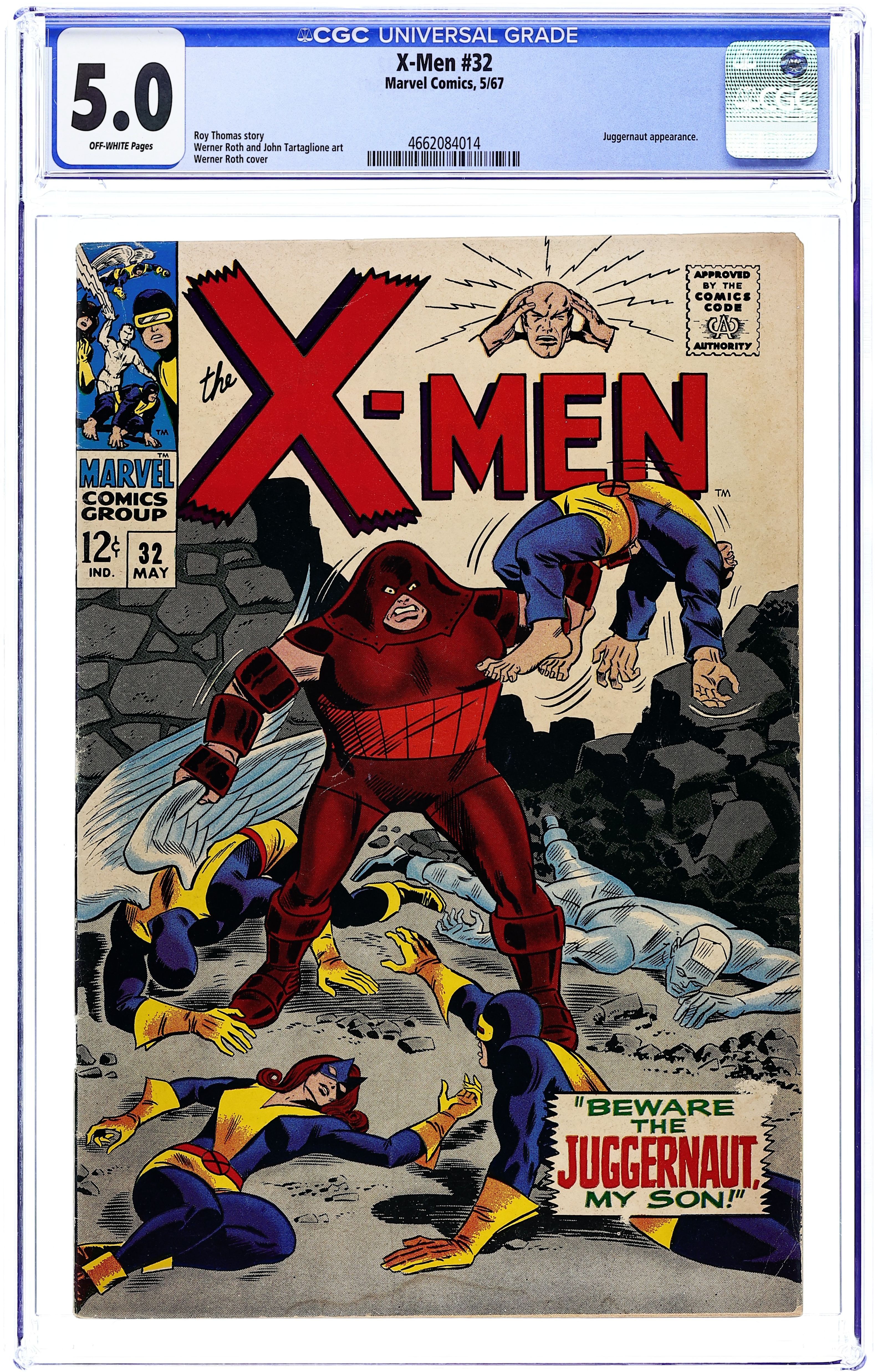 Cover pencils by Jack Kirby (layouts) and Werner Roth, inks by John Tartaglione. Beware the Juggernaut, My Son!, script by Roy Thomas, pencils by Werner Roth, inks by John Tartaglione; the X-Men attend Icemans 18th birthday party; Xavier works on Juggernaut, who is unconscious in the basement of the mansion. Ad for The Merry Marvel Marching Society. 36 pgs. $0.12. Cover price $0.12.