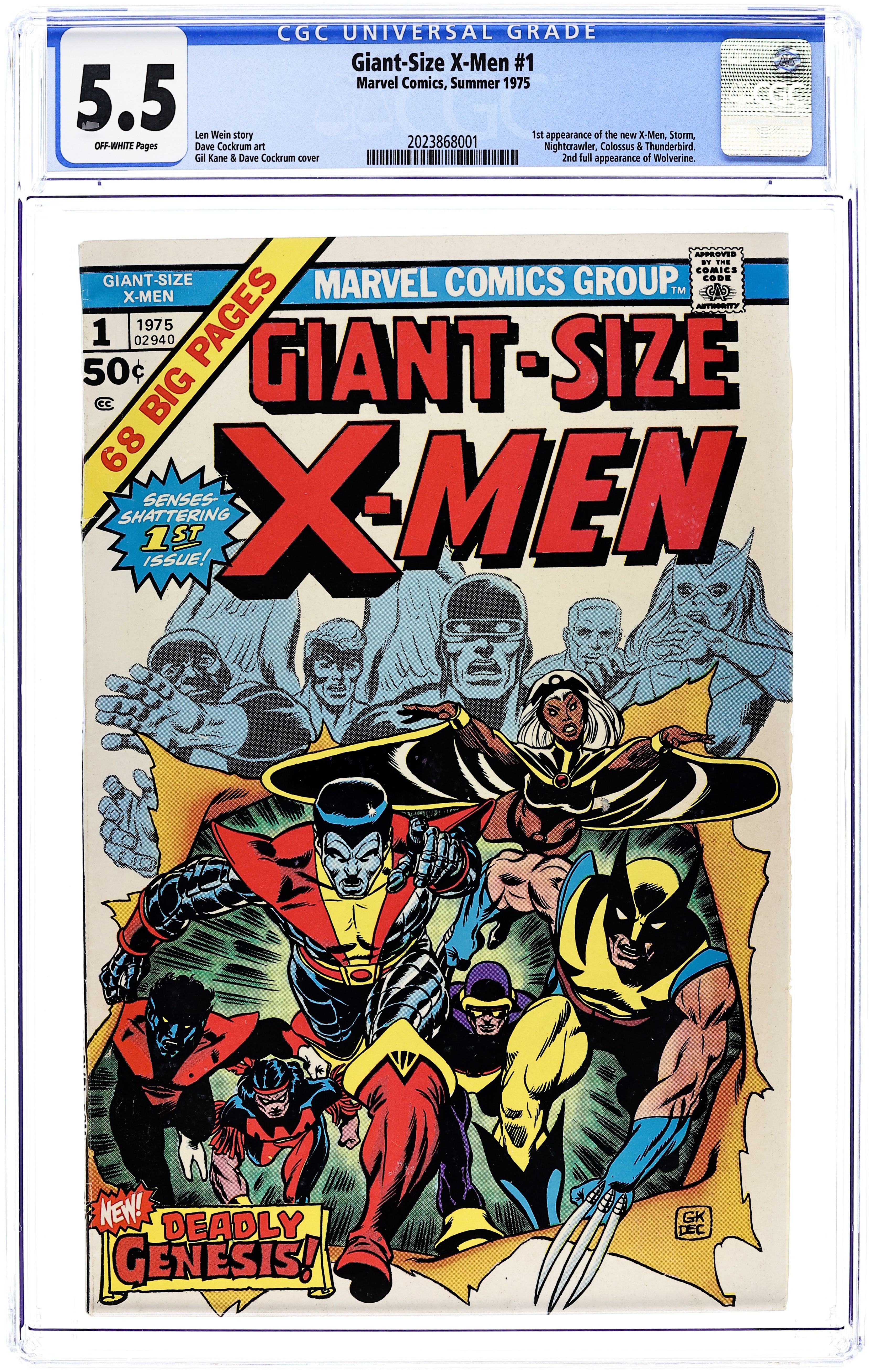 Cover pencils by Gil Kane and Dave Cockrum (original X-Men figures), inks by Dave Cockrum. 1st appearance of the new X-Men in "Second Genesis," script by Chris Claremont (plot assist, uncredited) and Len Wein (plot, script), art by Dave Cockrum; The old X-Men are captured by Krakoa, the Living Island, and Professor X forms a new team to rescue them; First appearances of Nightcrawler, Storm, Colossus, and Thunderbird; 2nd full appearance of Wolverine after Incredible Hulk 181; Appearances of Cyclops, Iceman, the Angel, Marvel Girl, the Banshee, Sunfire, Havok, Lorna Dane, and Mr. Fantastic (of the Fantastic Four); Beast cameo; Continued in X-MEN #94. "Call Him... Cyclops!", script by Roy Thomas, pencils by Werner Roth, inks by John Verpoorten; Explanation of Cyclops' powers. "I, the Iceman," script by Arnold Drake, pencils by Werner Roth, inks by John Verpoorten; Explanation of Iceman's powers. "The Female of the Species!", script by Linda Fite, pencils by Werner Roth, inks by Sam Grainger; Explanation of Marvel Girl's powers. 68 pgs., full color. Cover price $0.50.