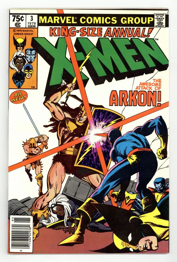 Tags: X-Men$28.00Newsstand Edition. A Fire in the Sky! - Written by Chris Claremont. Art by George Pérez and Terry Austin. Cover by Frank Miller and Terry Austin. The X-Men battle Arkon and are transported to his world where they are asked to help save it. Story takes place between Uncanny X-Men (1963 1st Series) #124 and 125. Characters in this issue: X-Men [Cyclops; Storm; Wolverine; Colossus; Nightcrawler; Banshee]; Edwin Jarvis; VILLAINS: Arkon; Imperions; CAMEO FLASHBACK: Captain America [Steve Rogers]; Thor; Iron Man [Tony Stark]. 52 pages, full color. Cover price $0.75.