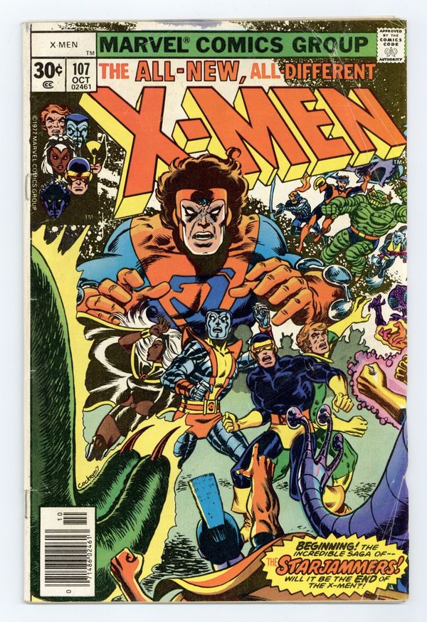 "Where No X-Man has Gone Before!" Part 2 of 3. Guest-starring the Starjammers (1st full appearance). Story by Chris Claremont. Art by Dave Cockrum and Dan Green. Story continued from Uncanny X-Men #105. Thanks to the awesome power of Phoenix, the X-Men have arrived on the far side of the universe. However things go from bad to worse when they are greeted by a small army of super-beings under the thrall of a sadistic madman. NOTE: 1st appearance of the Starjammers - Raza and Hepzibah - and the Shi'ar Imperial Guard. 36 pgs. Cover price $0.30.