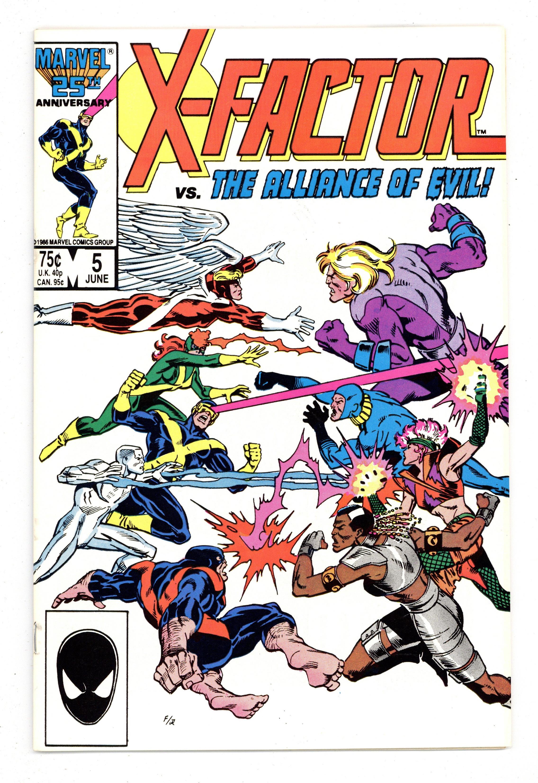 Direct Edition. "Tapped Out!" Part 1 of 2. 1st appearance of Apocalypse (shadowed cameo). Story by Bob Layton. Art by Jackson Guice and Joe Rubinstein. Cover by Ron Frenz and Joe Rubinstein. It's a classic super-hero/super-villain throw-down when X-Factor must battle the Alliance of Evil (Frenzy, Tower, Stinger, and Timeshadow) for the life of a mutant. Featuring a new menace by the name of Apocalypse, an evil mutant who will become a major thorn in the sides of the X-Men and X-Factor. Cover price $0.75.