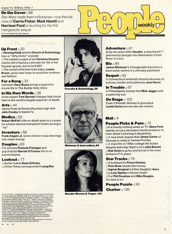 August 14, 1978. Star Wars cover and article, Lynda Carter, Scientology, Gary Busey, Houdini, mini-reviews of National Lampoon's Animal House and Eraserhead, and more. 8.25-in. x 11-in.; black and white; 106 pages. Cover price $0.75.