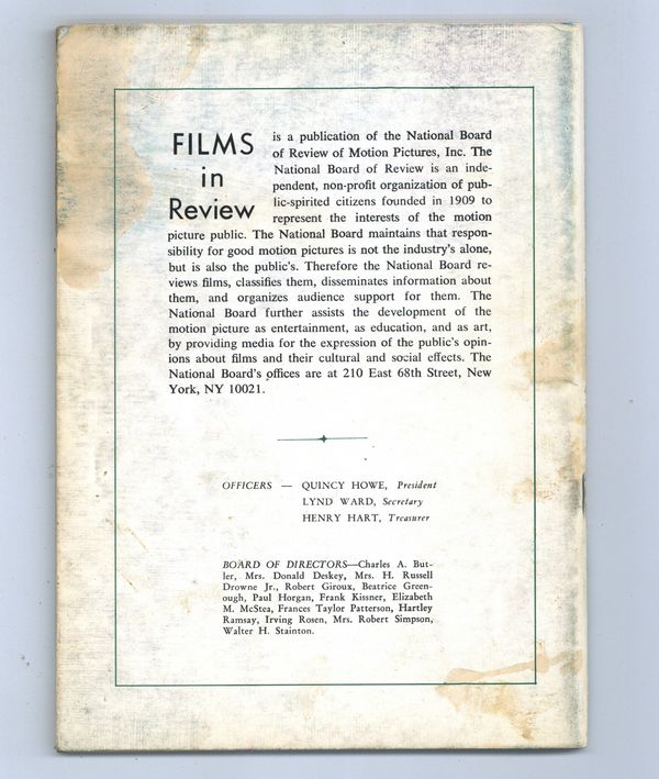 Film in Review is a publication of the National Board of Review of Motion Pictures, Inc, an independent, non-profit organization of public citizens founded in 1909 to represent the interests of the motion picture public. This National Board further assists the development of the motion picture as a source of entertainment, as education, and as art, by providing media for the expression of the public's opinion about films and their cultural and social effects. 5 1/2-in. x 7 1/2-in. Cover price $0.90.
